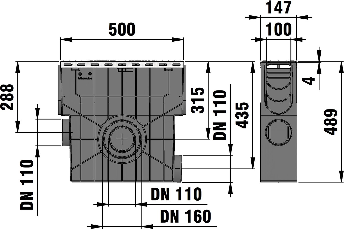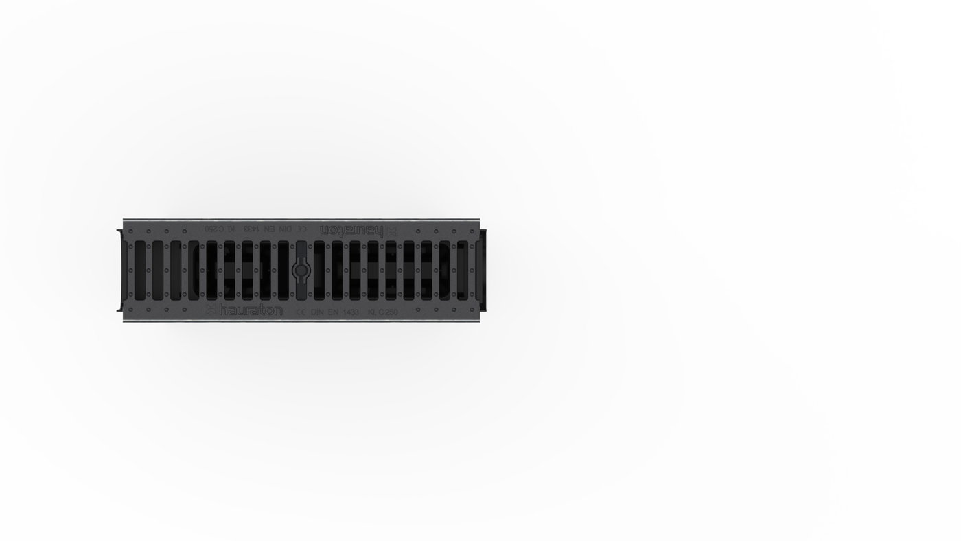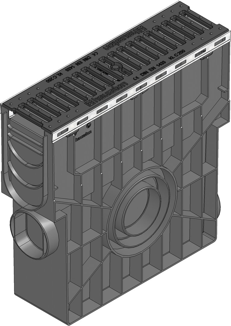 RECYFIX Plus 100 - събирателна шахта от РЕ-РР полиетилен полипропилен, съгласно EN 1433, с вграден метален профил за решетката, възможност за тристранно включване, с подвижна полиетиленова кошница, пригодена за двустранно включване на улеи тип Recyfix Plus 100 , с чугунена решетка и заключване, SW 14 мм, черна, клас натоварване A 15 - C 250, дълж./шир./вис. 500x160x419 мм, Арт.№ 40356