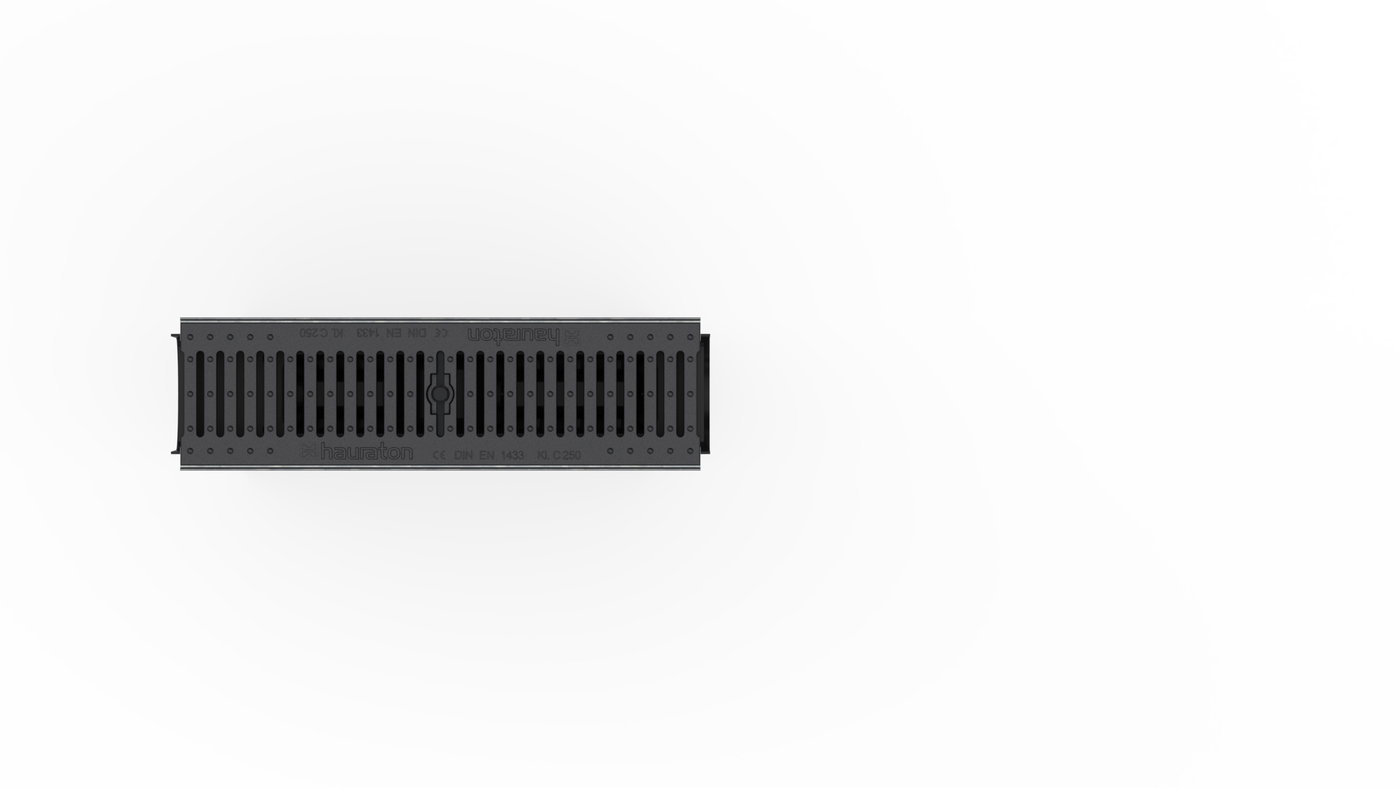 RECYFIX Plus 100 - събирателна шахта от РЕ-РР полиетилен полипропилен, с вграден метален профил за решетката, съгласно EN 1433, възможност за тристранно включване, с подвижна полиетиленова кошница, пригодена за двустранно включване на улеи тип Recyfix Plus 100 , с чугунена решетка, размер на шлица 6мм, черна, клас натоварване A 15 - C 250, и заключване, дълж./шир./вис. 500x160x419 мм, Арт. № 40357