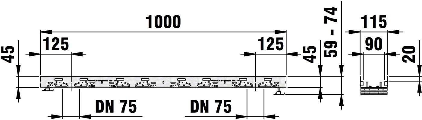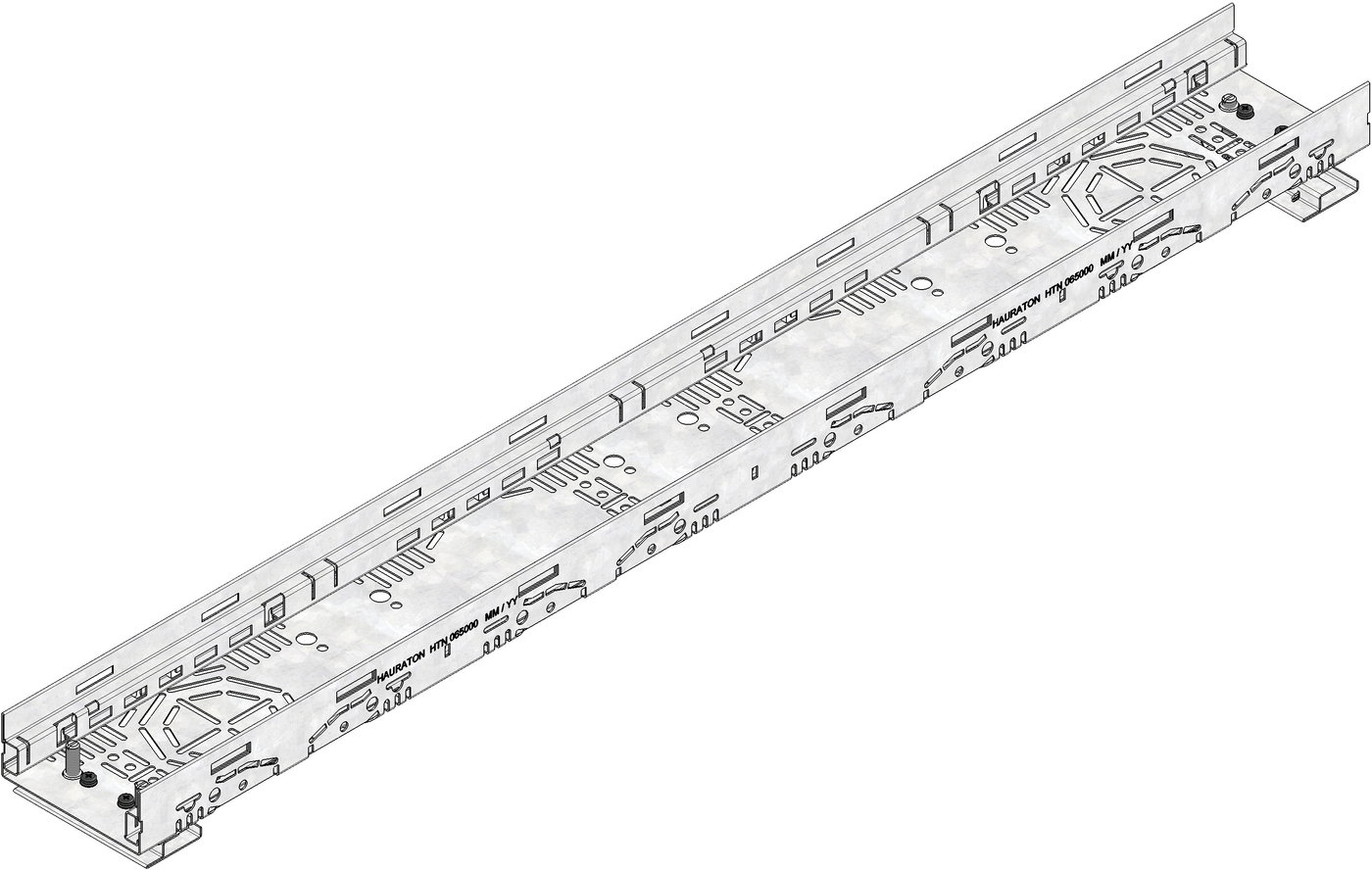 DACHFIX STEEL 115 - улей тип 45 с комплекти за регулиране на височината, изработен от устойчива на корозия поцинкована стомана, подходящ за движение на пешеходци и за достъп на инвалидни колички, решетъчна опора, наклонена навътре, с двустранна перфорация, както и с интегрирана перфорация в основата на улея за прилагане на място на елемент за свързване на тръби с DN/OD 75 или DN/OD 110, вкл. 2 бр. комплекти за регулиране на височината, регулируема височина 59-74 мм, Д/Ш/В 1000x115x59-74 мм, Арт. номер 65003