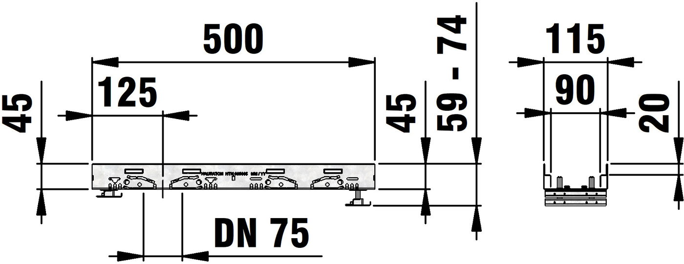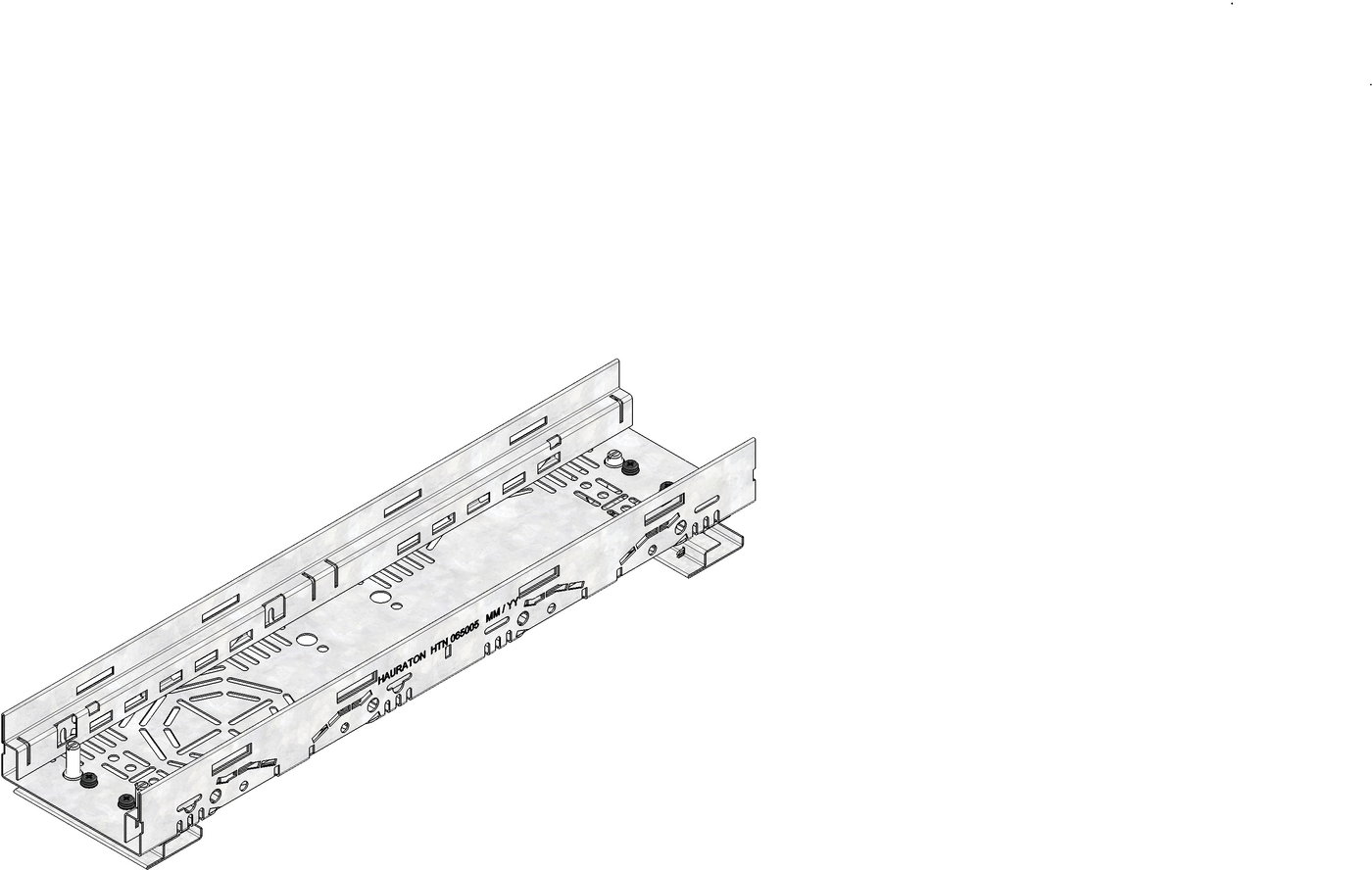 DACHFIX STEEL 115 - улей тип 45 с комплект за регулиране на височината, изработен от корозионно устойчива поцинкована стомана, подходящ за пешеходно движение и за достъп на инвалидни колички, оребряване, наклонена навътре, с двустранна перфорация, както и с интегрирана перфорация в основата на улея за изпълнение на място на елемент за свързване на тръби DN/OD 75 или DN/OD 110, вкл. 2 бр. комплект за регулиране на метър, регулируема височина 59-74 мм, Д/Ш/В 500x115x59-74 мм, артикулен № 65008