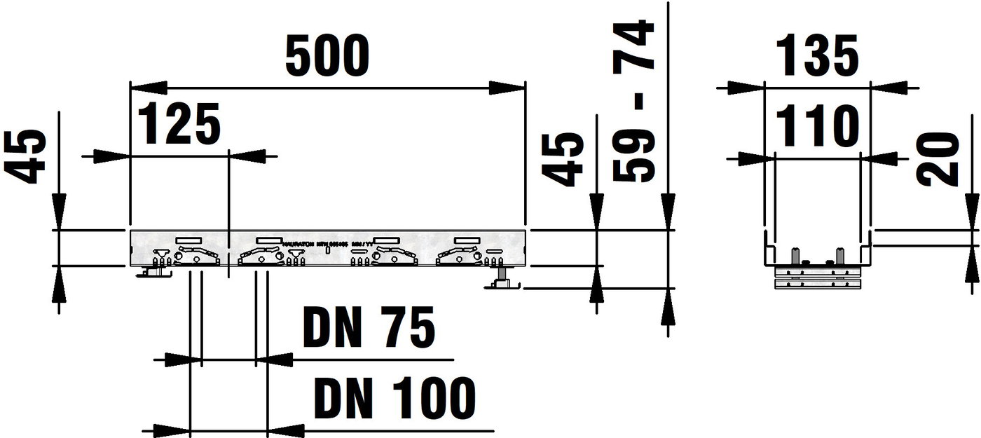 DACHFIX STEEL 135 - улей тип 45 с регулиращи комплекти за регулиране на височината, изработен от устойчива на корозия поцинкована стомана, подходящ за пешеходно движение и достъп за инвалидни колички, оребрена решетка, наклонена навътре, с двустранна перфорация, както и с интегрирана перфорация в основата на улея за изпълнение на място с елемент за свързване на тръби DN/OD 75 или DN/OD 110, вкл. 2 регулиращи комплекта на метър, регулируема височина 59-74 мм, Д/Ш/В 500x135x59-74 мм, артикулен номер 65108
