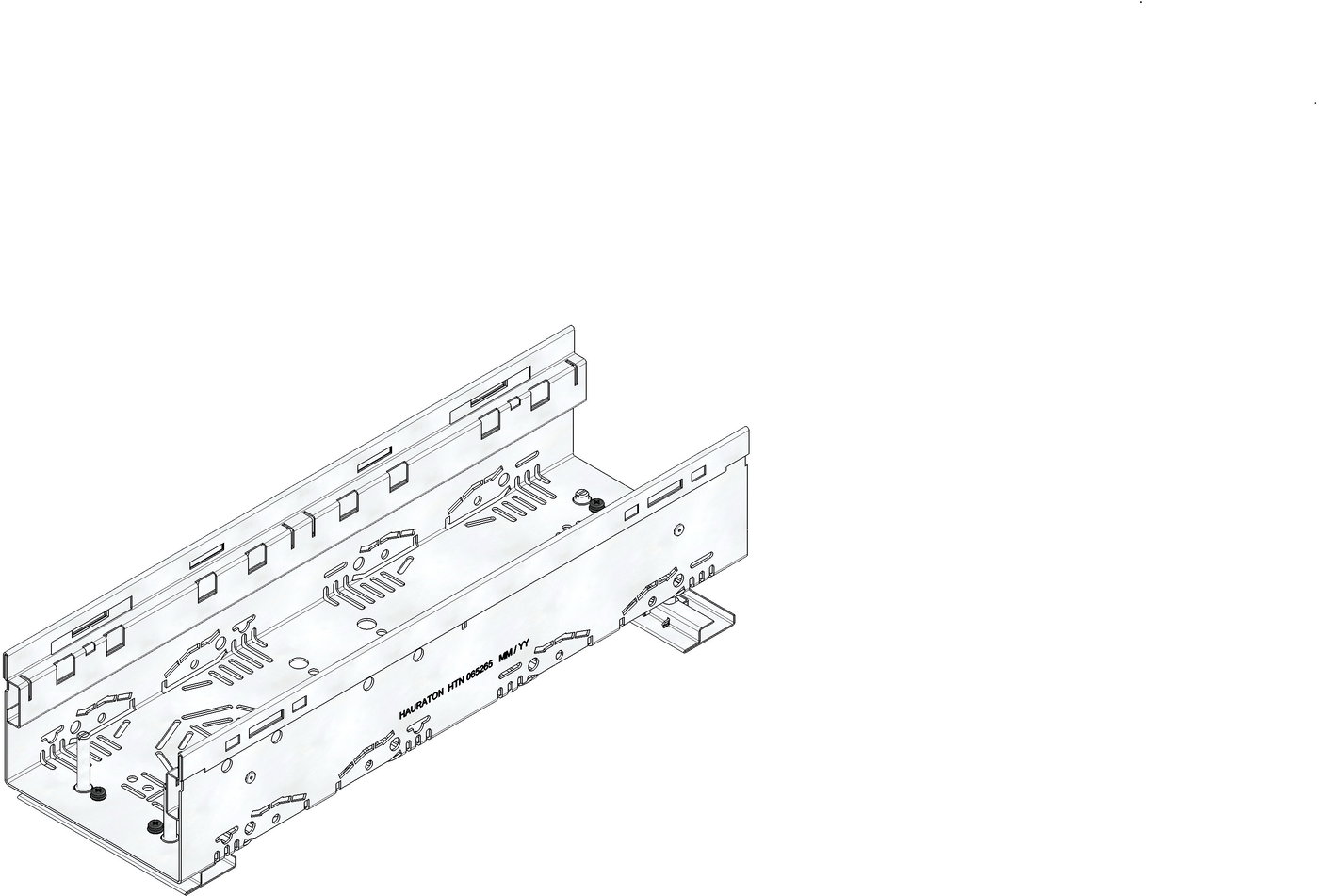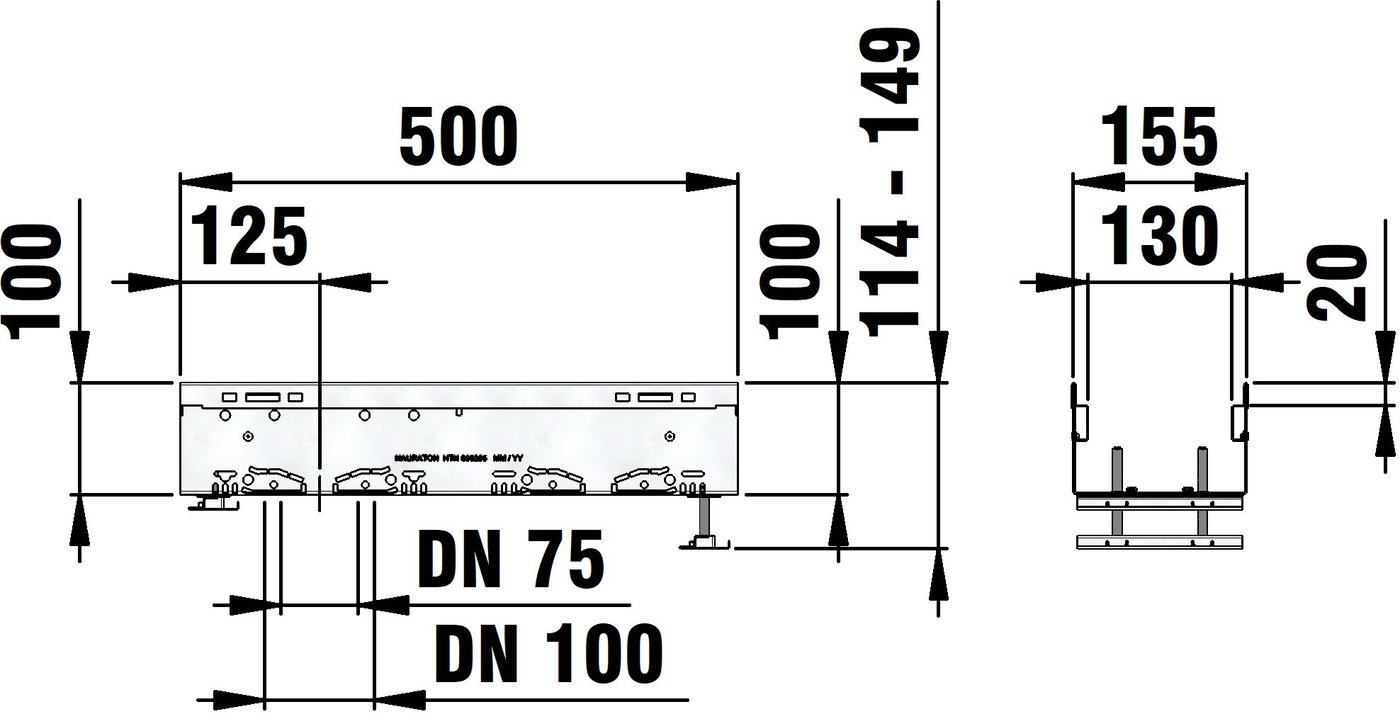 DACHFIX STEEL 155 - улей тип 100 с комплекти за регулиране на височината, изработен от неръждаема стомана CNS 1.4301 (AISI 304), подходящ за пешеходно движение и достъп за инвалидни колички, оребрена решетка, наклонена навътре, с двустранна перфорация, както и с интегрирана перфорация в основата на улея за изпълнение на място на елемент за свързване на тръби DN/OD 75 или DN/OD 110, вкл. 2 комплекта за регулиране на метър, регулируема височина 114-149 mm, Д/Ш/В 500x155x114-149 mm, артикулен № 65268
