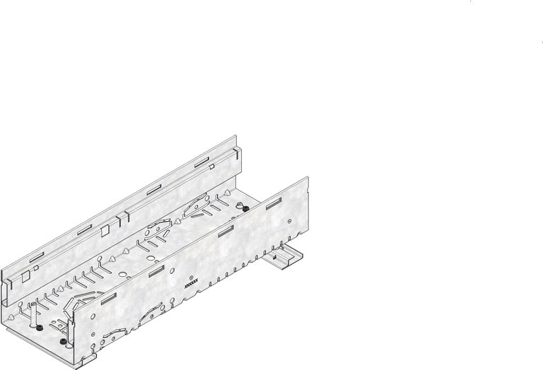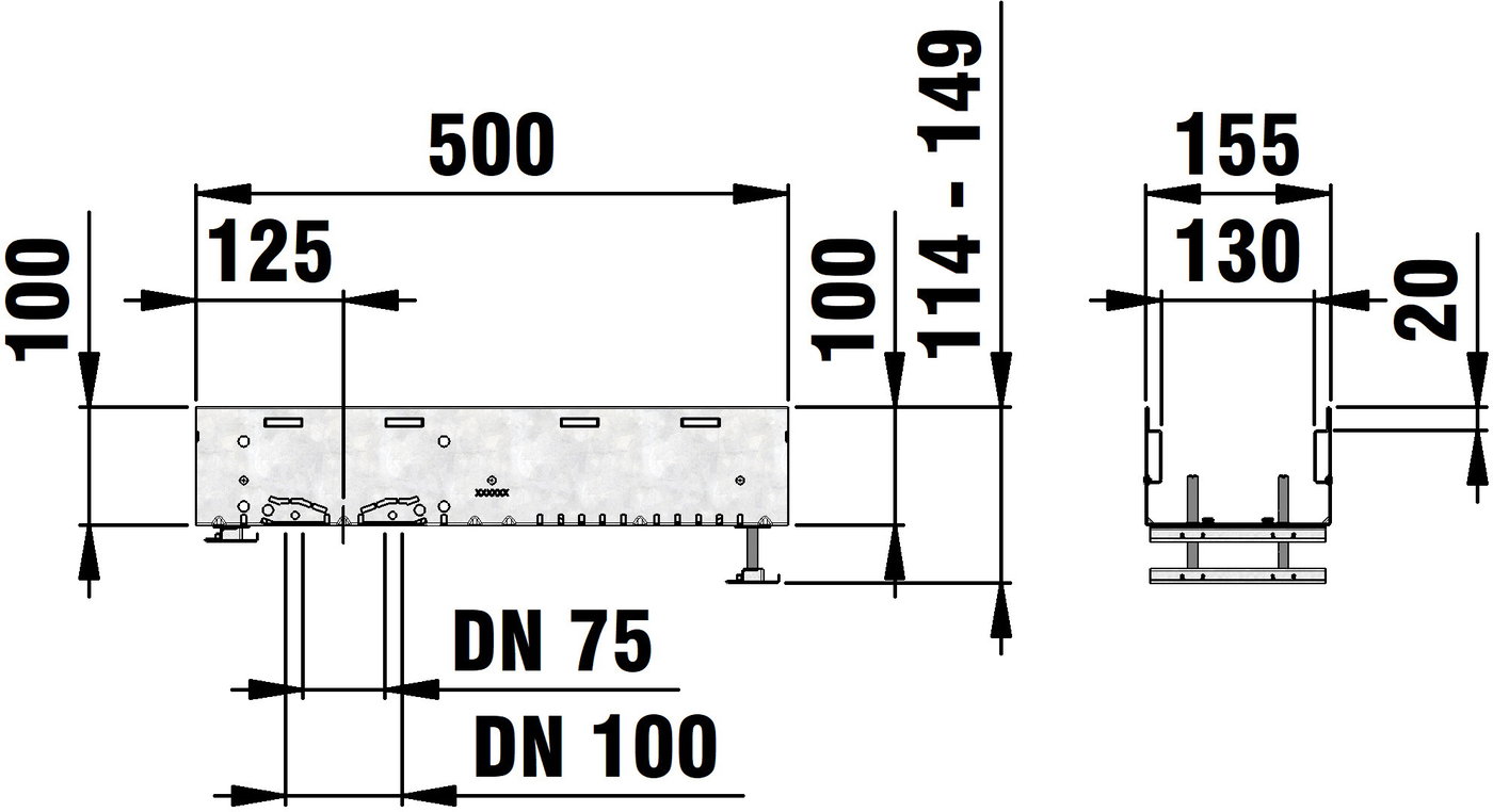 DACHFIX STEEL 155 - улей тип 100 с комплекти за регулиране на височината, изработен от устойчива на корозия поцинкована стомана, подходящ за движение на пешеходци и достъп за инвалидни колички, оребрена решетка, накланяща се навътре, с двустранна перфорация, както и с интегрирана перфорация в основата на улея за изпълнение на място за елемент за свързване на тръби DN/OD 75 или DN/OD 110, вкл. 2 комплекта за регулиране за брой, регулируема височина 114-149 mm, Д/Ш/В 500x155x114-149 mm, артикулен № 65258