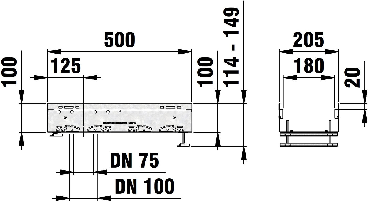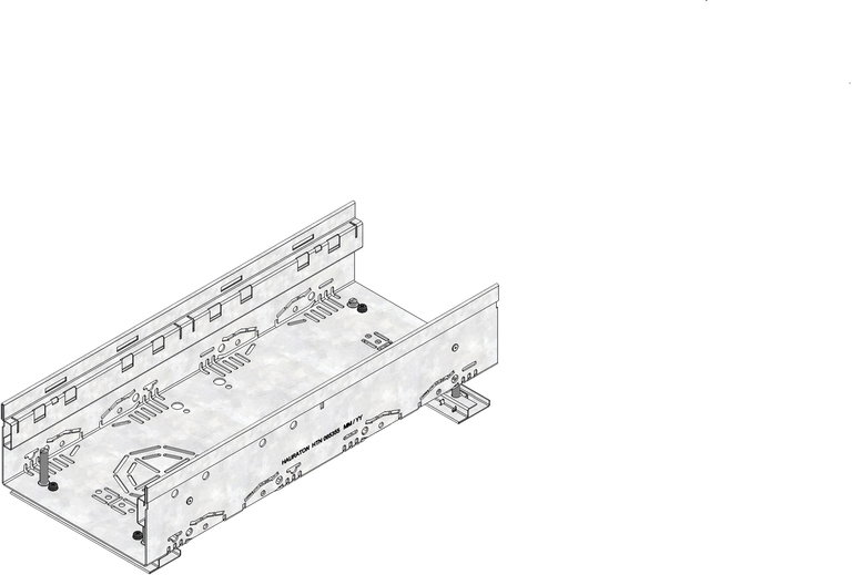 DACHFIX STEEL 205 - улей тип 100 с комплекти за регулиране на височината, изработен от устойчива на корозия поцинкована стомана, подходящ за пешеходно движение и достъп за инвалидни колички, оребрена решетка, наклонена навътре, с двустранна перфорация, както и с интегрирана перфорация в основата на улея за изпълнение на място с елемент за свързване на тръби DN/OD 75 или DN/OD 110, вкл. 2 комплекта за регулиране на брой, регулируема височина 114-149 mm, Д/Ш/В 500x205x114-149 mm, артикулен № 65358