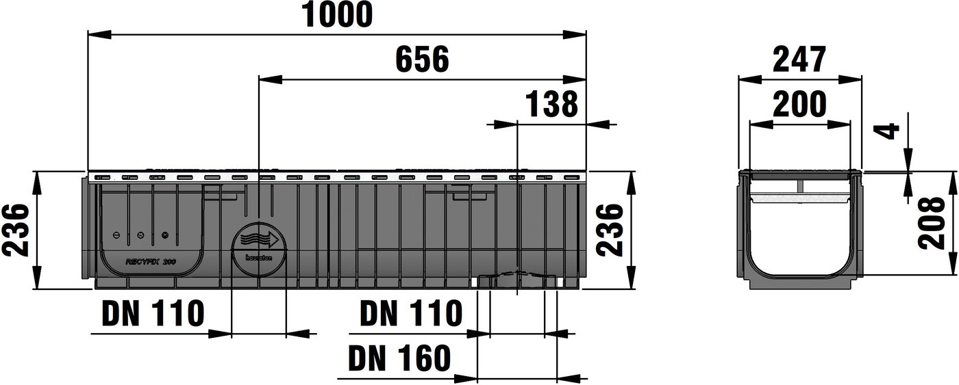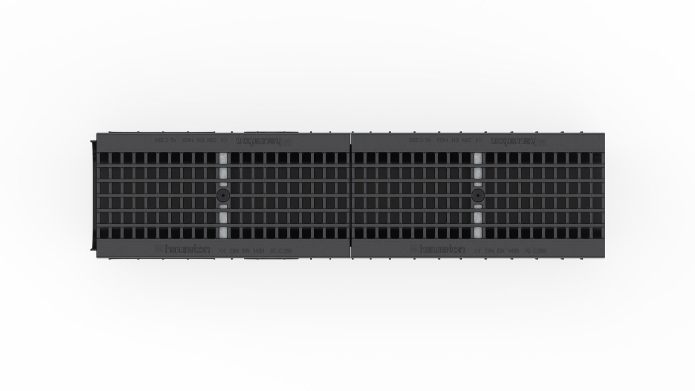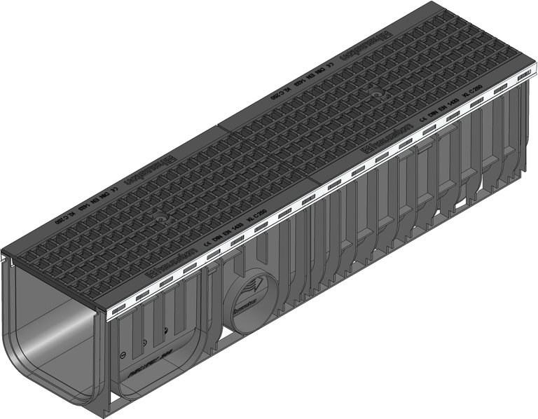 RECYFIX PLUS 200 Тип 020 – улейно тяло от PE-PP, с вграден неръждаем кант, съгласно DIN V 19580/EN 1433, с възможност за странично и вертикално включване към канализацията, с GUGI-чугунена мрежовидна решетка, МW 15/25 mm, заключена, черна, клас натоварване A 15 – C 250, дължина/ширина/височина 1000x260x236 mm, Aрт. № 42772