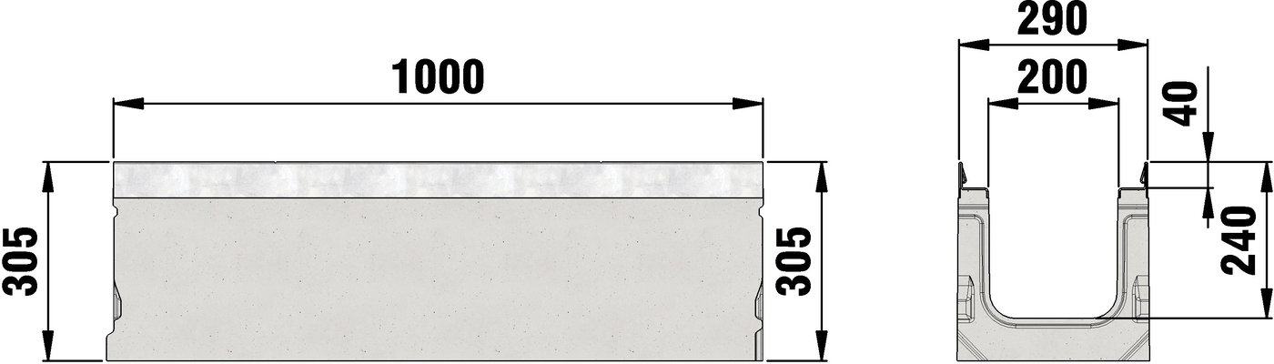 SERVICE CHANNEL FASERFIX SUPER 200 тип 01 ъглов - улей изработен от бетон с подсилени фибровлакна, клас на натоварване А 15 - E 600 спрямо DIN 19580 / EN 1433, CE-съответствие, с поцинковант кант и безболтово заключване SIDE-LOCK, Д/В/Ш/ 1000х290х305мм, арт.№32068