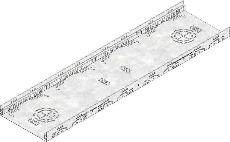 DACHFIX STEEL 255 - žlab, typ 45 z pozinkované oceli, s aretačním systémem, vhodný pro chodce i pro osoby s pohybovým omezením, perforace po obou stranách žlabu, předpřipravené prolisy DN 75 nebo DN 100 pro napojení potrubí, D/Š/V 1000x255x45 mm, obj.č. 65400