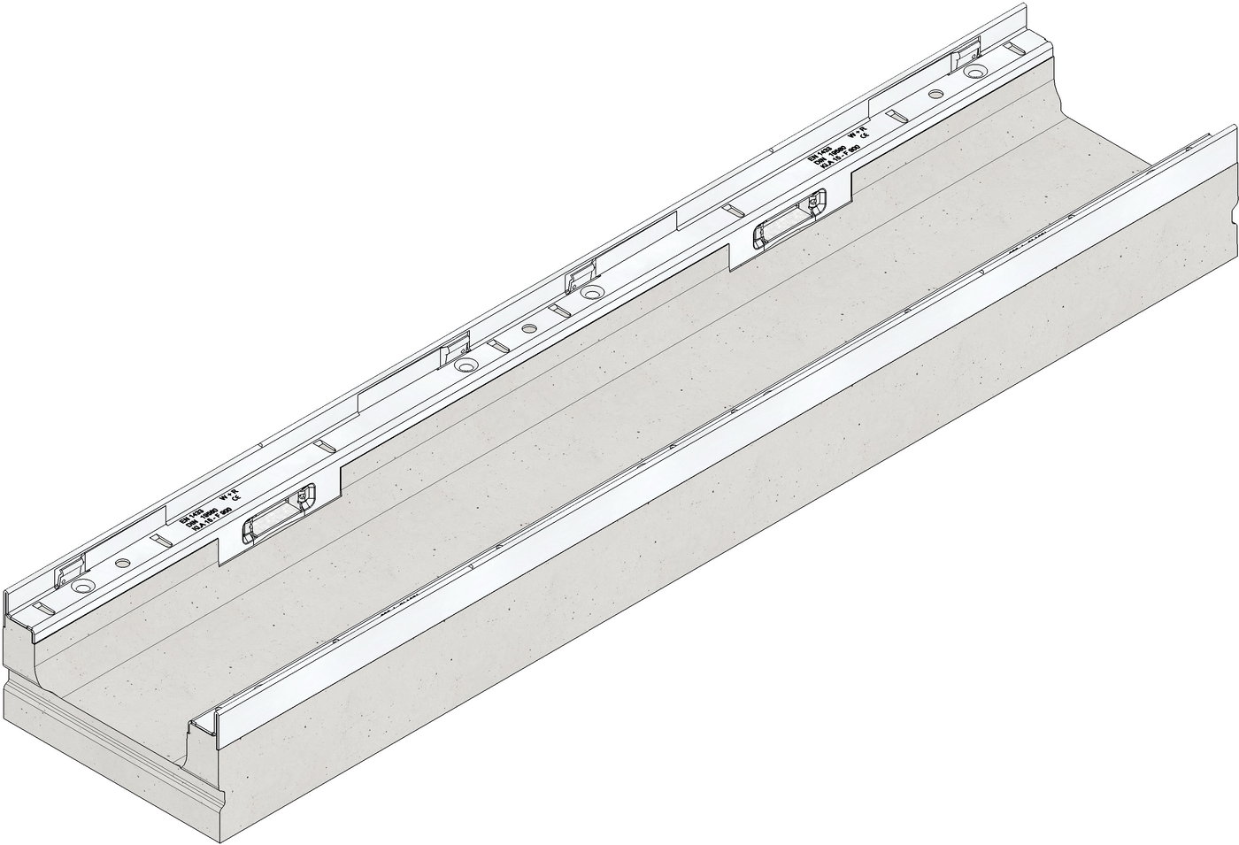 FASERFIX KS 150 – nízký žlab, typ 110, z betonu vyztuženého vlákny, třída zatížení až do F 900 dle ČSN EN 1433, CE označení, rámy z nerezové oceli se SIDE-LOCK aretačním systémem krytů bez šroubů, celkem 8 bodů zajištění krytů, ochrana proti podélnému pohybu krytu , těsnící drážka, D/Š/V 1000x210x110 mm, obj.č. 2521