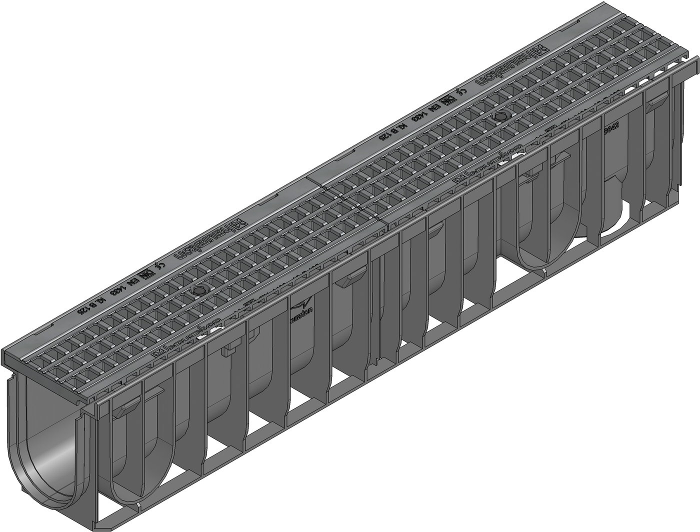 SPORTFIX TYP ROME I - žlab z PP kompozitu, typ 010 s GUGI kompozitním pororoštem pro umělý trávník, MW 15/25, PA-GF, černý, s aretačním systémem, ochrana proti podélnému pohybu krytu, třída zatížení až do B 125 dle ČSN EN 1433, odtok ze dna žlabu DN 100, D/Š /V 1000x160x200 mm, obj.č. 7862