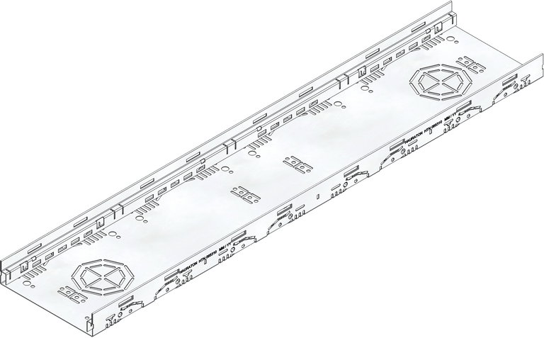 DACHFIX STEEL 205 Typ 45 - Rinnenunterteil, aus Edelstahl CNS 1.4301, begehbar und rollstuhlbefahrbar, Rostauflage nach innen gekantet, im Seiten- und Sohlbereich perforiert, mit Anschlussmöglichkeit im Sohlbereich für Anschlussstutzen DN/OD 75 oder DN/OD 100 sowie 8-fache Anschlussmöglichkeit im Seitenbereich für Stichkanal, inkl. möglicher 4-facher Fixierungsankerfunktion, LxBxH 1000x205x45 mm, Art.-Nr. 65310
