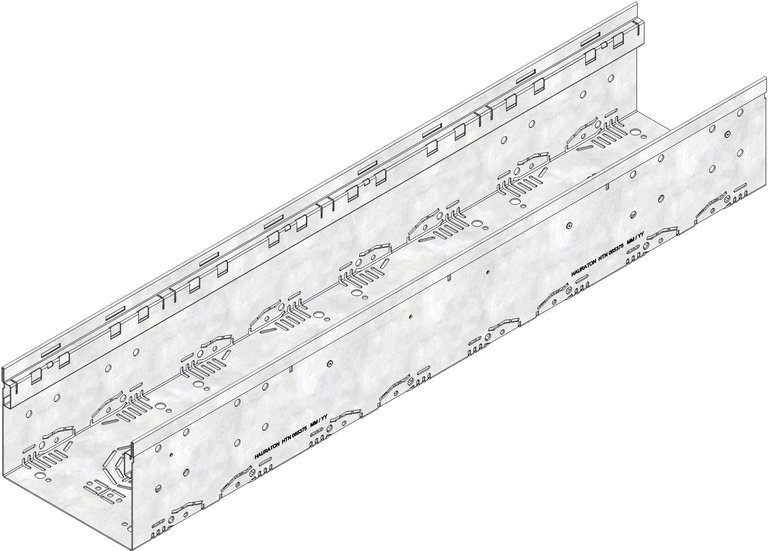 DACHFIX STEEL 205 Typ 150 - Rinnenunterteil, aus korrosionsgeschütztem verzinkten Stahl, begehbar und rollstuhlbefahrbar, Rostauflage nach innen gekantet, im Seiten- und Sohlbereich perforiert, mit Anschlussmöglichkeit im Sohlbereich für Anschlussstutzen DN/OD 75 oder DN/OD 100 sowie 8-fache Anschlussmöglichkeit im Seitenbereich für Stichkanal, inkl. möglicher 4-facher Fixierungsankerfunktion, LxBxH 1000x205x150 mm, Art.-Nr. 65375