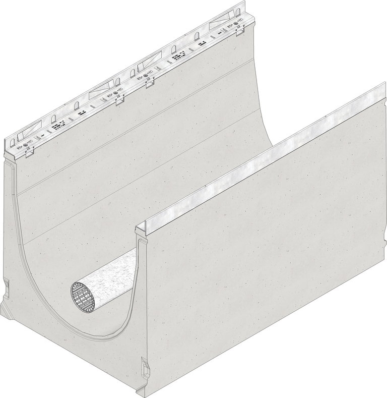 DRAINFIX CLEAN FSU 500 Typ 01 - Mittelelement, Filtersubstratrinne mit dem Wirkprinzip der Oberflächenfiltration, aus faserbewehrtem Beton, Nennweite 500 mm, Belastungsklasse A 15 bis F 900 nach DIN 19580/EN 1433, CE-konform, mit allgemeiner bauaufsichtlicher Zulassung Zul.-Nr. Z-84.2-7, mit verzinkter Stahlzarge und schraublosem Schnellverschluss SIDE-LOCK, 8-fach Arretierung je lfdm., inkl. DRAINFIX CLEAN - Drainagerohr DN/OD 100 mit Geotextil ummantelt und Verbinder, LxBxH 1000x590x630 mm, Art.-Nr. 97692
