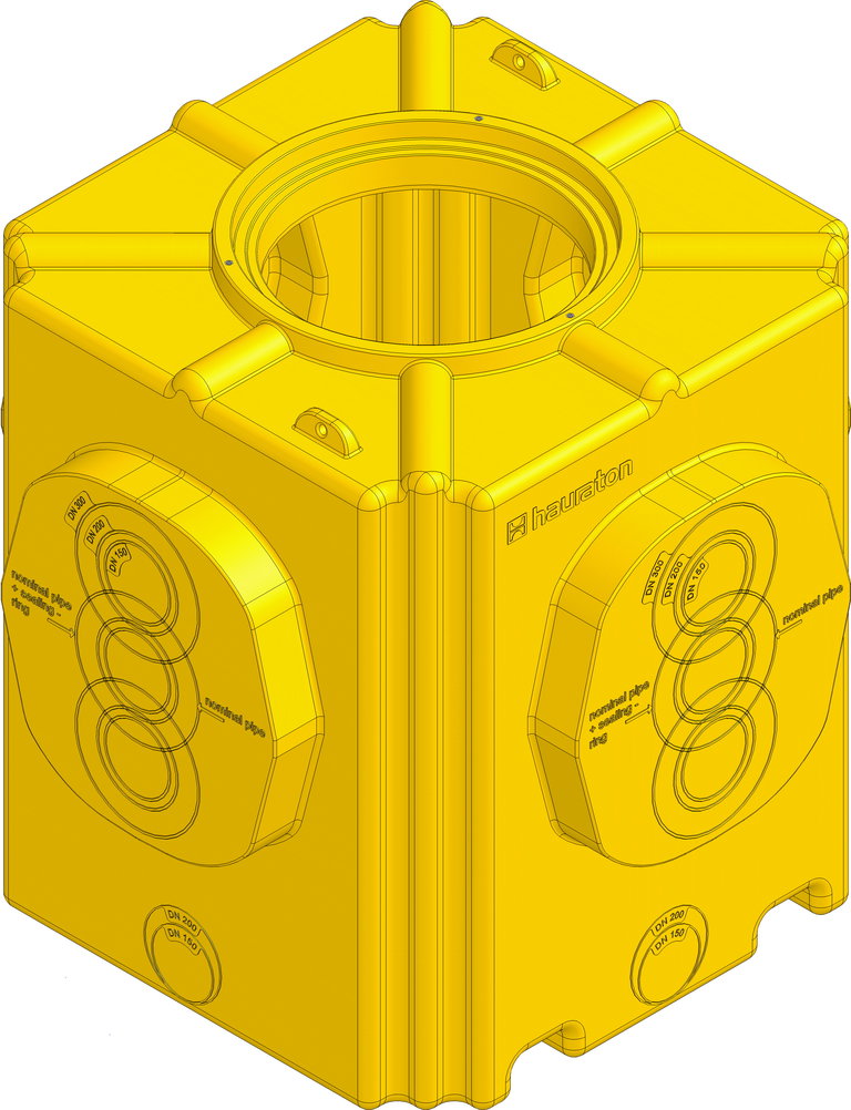 DRAINFIX TWIN - Multifunktionsschacht, Größe 1, Wandstärke 10 mm, aus Polyethylen, gelb, mit Anschlussmöglichkeit für TWIN Module an allen 4 Seiten, oder optional Anschlussmöglichkeit DN/OD 150/200/300 auf an allen 4 Seiten, mit Anschlussmöglichkeit DN/OD 150/200 an der Basis auf allen 4 Seiten, - für die richtige Fundamenttiefe ist ggf. die Höhe der verwendeten Schachterhöhung zu berücksichtigen -, LxBxH 1280x1280x1460 mm, Art.-Nr. 96540