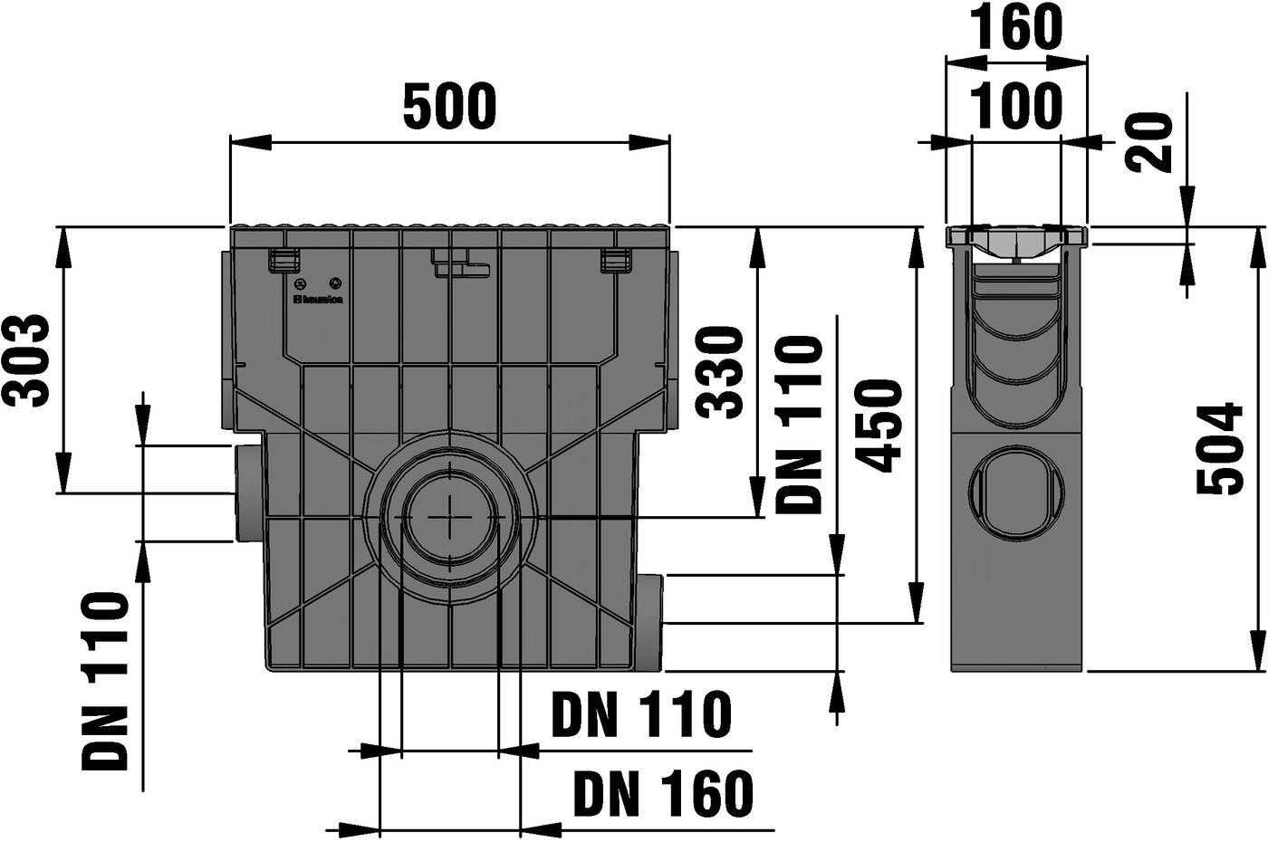 RECYFIX PRO 100 - Einlaufkasten aus recyceltem Polypropylen, mit integrierter Zarge, 4-seitiger Anschlussstutzen (stirnseitig DN/OD 110, seitlich beidseitig DN/OD 110/160), mit herausnehmbarem Schmutzfangeimer aus Kunststoff, geeignet für den beidseitigen Anschluss von Rinnentypen RECYFIX PRO 100, mit FIBRETEC Design Stegrost SW 110/9 mm, Farbe Stein, aus faserverstärktem Polyamid, mit Längsschubsicherung und Arretierung, Belastungsklasse A 15 - C 250 nach DIN 19580/EN 1433, LxBxH 500x160x504 mm, Art.-Nr. 47414