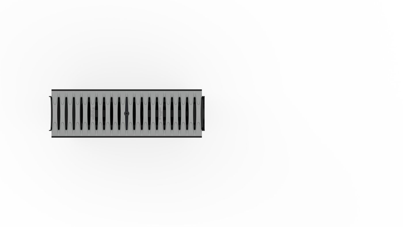 für NW 100, mit Schmutzfangeimer aus Kunststoff, mit FIBRETEC Design Stegrost, SW 110/9 mm, in der Farbe Stein, Kl. C 250, arretiert , 0,5 m