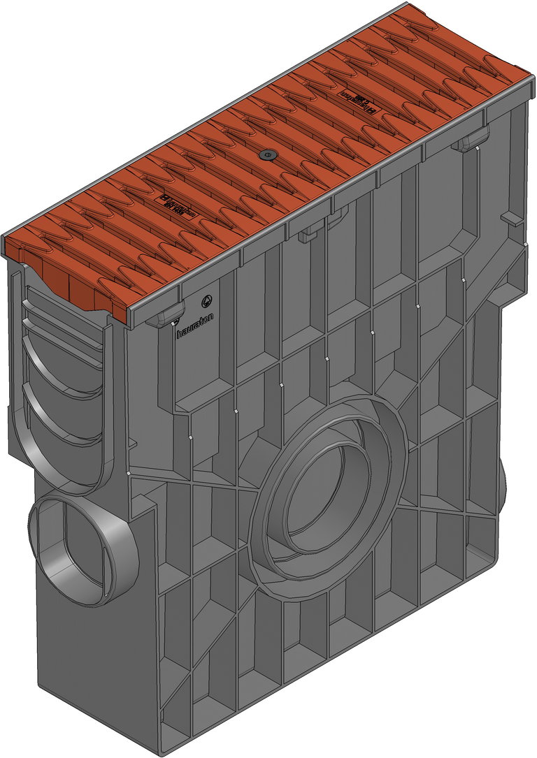 RECYFIX PRO 100 - Einlaufkasten aus recyceltem Polypropylen, mit integrierter Zarge, 4-seitiger Anschlussstutzen (stirnseitig DN/OD 110, seitlich beidseitig DN/OD 110/160), mit herausnehmbarem Schmutzfangeimer aus Kunststoff, geeignet für den beidseitigen Anschluss von Rinnentypen RECYFIX PRO 100, mit FIBRETEC Design Stegrost SW 110/9 mm, Farbe Ziegel, aus faserverstärktem Polyamid, mit Längsschubsicherung und Arretierung, Belastungsklasse A 15 - C 250 nach DIN 19580/EN 1433, LxBxH 500x160x504 mm, Art.-Nr. 47449