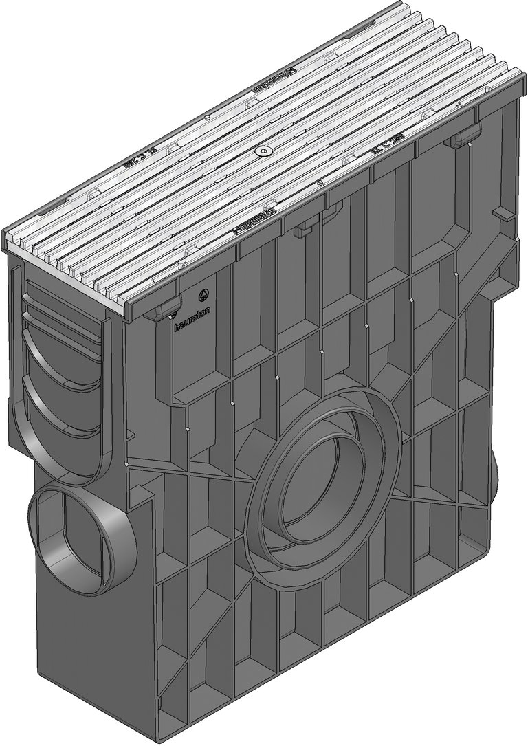 RECYFIX PRO 100 - Einlaufkasten aus recyceltem Polypropylen, mit integrierter Zarge, 4-seitiger Anschlussstutzen (stirnseitig DN/OD 110, seitlich beidseitig DN/OD 110/160), mit herausnehmbarem Schmutzfangeimer aus Kunststoff, geeignet für den beidseitigen Anschluss von Rinnentypen RECYFIX PRO 100, mit Guss-Längsstabrost aus Sphäroguss EN-GJS, Stababstand 9 mm, verzinkt, mit Längsschubsicherung und Arretierung, Belastungsklasse A 15 - C 250 nach DIN 19580/EN 1433, LxBxH 500x160x504 mm, Art.-Nr. 48656