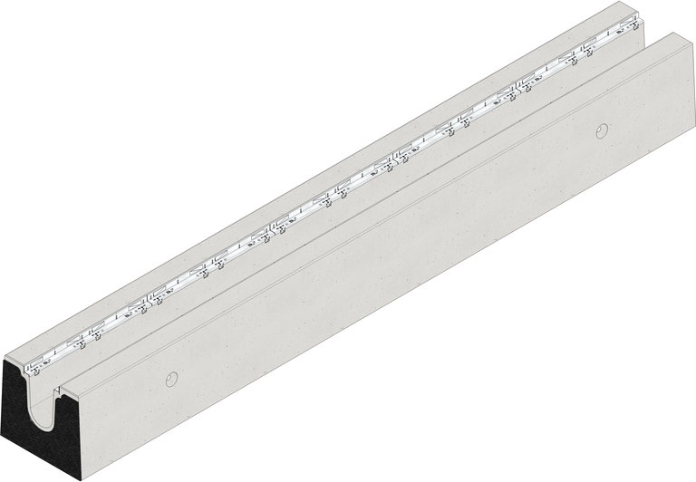 FASERFIX BIG BLS 200 Typ 065 - Rinnenunterteil aus FDE Beton als Stahlbeton-Fertigteil C60/75, Brandverhaltensklasse A1 nach EN 13501-1, Belastungsklasse A 15 - F 900 nach DIN 19580/EN 1433, mit geprüfter statischer Berechnung und Bemessung für LCN 70 gemäß ICAO. Entsprechend ADV für BFZ 750, mit maßgebender Achslast Qa = 64,66 to. Mit Nachweis gegen Ermüdung auf Basis der repräsentativen Anzahl überlagerter Lastwechsel. Entwässerungsquerschnitt von 552 cm², mit Edelstahlzarge CNS 1.4301, 16-fache Arretierungsmöglichkeit pro Meter, mit schraublosem Schnellverschluss SIDE-LOCK und zusätzlicher Möglichkeit der 8-fachen Verschraubung, mit werkseitig montierter PE-Raumfugeneinlage d=10 mm an einer Stirnseite, mit allgemeiner bauaufsichtlicher Zulassung für LAU-Anlagen und AKR-Performance Test, Einlegetiefe Abdeckung 40 mm, LxBxH 5000x600x575 mm, Art.-Nr. 3709