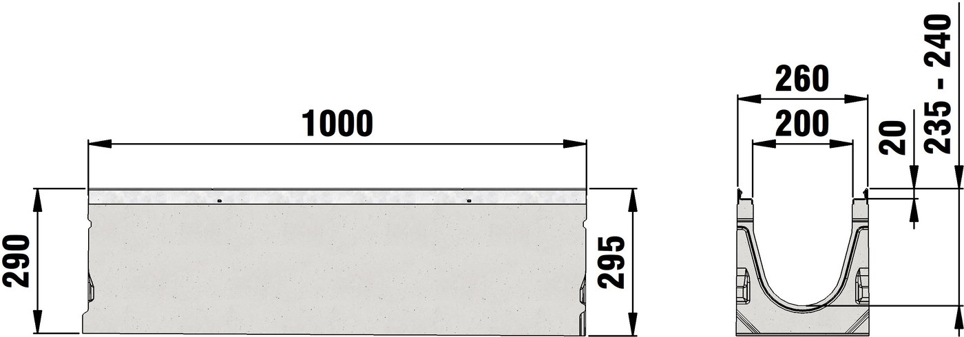 FASERFIX KS 200 Typ 1- 9 - Rinnenunterteil aus faserbewehrtem Beton, Belastungsklasse A 15 - F 900 nach DIN 19580/EN 1433, CE-konform, mit Sohlengefälle 0,5 %, mit verzinkter Stahlzarge und schraublosem Schnellverschluss SIDE-LOCK für schnelle und einfache Montage der Abdeckung, zusätzlich Knebelverschraubung möglich, 8-fache Arretierung, mit Dichtungsfalz, LxBxH 1000x260x275-320 mm,Art .-Nr. 12001 - 12009