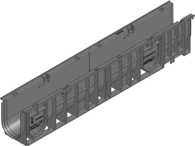 MEDIENRINNE RECYFIX STANDARD 100 Typ 010 -Rinnenunterteil aus recyceltem Polypropylen, mit seitlicher und senkrechter Anschlussmöglichkeit DN/OD 110, Belastungsklasse A 15 - C 250 nach DIN 19580 / EN 1433, in Verbindung mit Schlitzaufsätzen bis Klasse D 400 nach EN 1433, L/B/H 1000x150x185 mm, Art.Nr. 32105