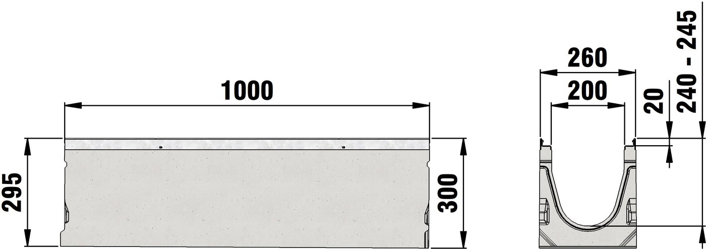 FASERFIX KS 200 Typ 1- 9 - Rinnenunterteil aus faserbewehrtem Beton, Belastungsklasse A 15 - F 900 nach DIN 19580/EN 1433, CE-konform, mit Sohlengefälle 0,5 %, mit verzinkter Stahlzarge und schraublosem Schnellverschluss SIDE-LOCK für schnelle und einfache Montage der Abdeckung, zusätzlich Knebelverschraubung möglich, 8-fache Arretierung, mit Dichtungsfalz, LxBxH 1000x260x275-320 mm,Art .-Nr. 12001 - 12009