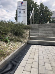 RECYFIX PRO 150 type 115 - Channel body made of recycled polypropylene, with integrated edge frames, with vertical connection possibility DN/OD 75/110, with FIBRETEC design slotted grating SW 150/9 mm, made of fibre-reinforced polyamide, black, with longitudinal slide protection and locking, load class A 15 - B 125 according to EN 1433, LxWxH 1000x212x115 mm, item no. 47133