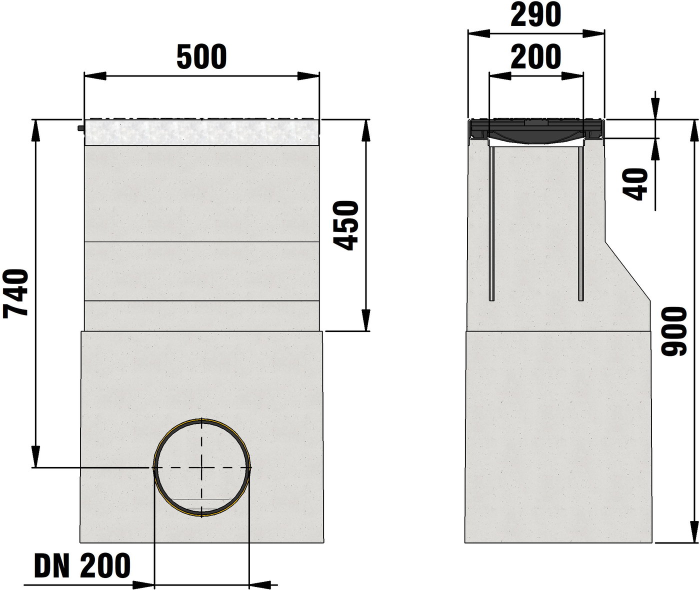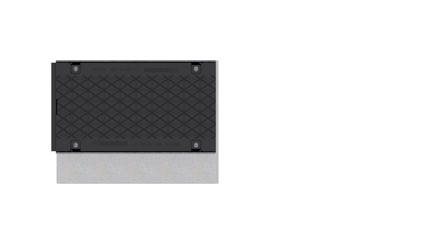 DRAINFIX CLEAN FSU 200 - Sump unit, 2-part, made of fibre-reinforced concrete, with edge frames made of galvanised steel, load class A 15 - F 900 according to EN 1433, one-sided connection possibility with PVC-U pipe outlet DN/OD 200 (lateral), with removable silt bucket made of galvanised steel, ductile iron grating, closed, made of spheroidal ductile iron EN-GJS-500-7, KTL-coated, load class A 15 - E 600 according to EN 1433, with longitudinal slide protection, 4-fold locking, suitable for both-sided connection of channel types DRAINFIX CLEAN FSU 200, LxWxH 500x290x900 mm, item no. 97261