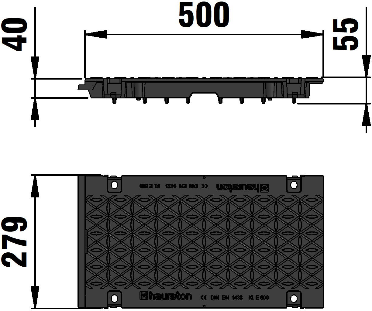 Ductile iron grating closed, KTL-coated, cl. E 600, MEDIA CHANNEL FASERFIX SUPER 200, 0.5 m