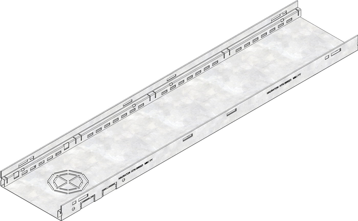 STEELFIX REGULAR 205 type 45 - Channel body, made of corrosion-protected galvanised steel, pedestrian and wheelchair-accessible, grating support tilted inwards, channel base and sides closed, but with perforation in the channel base as connection possibility for pipe outlet connection DN/OD 75 or DN/OD 100 and connection possibility with STEELFIX REGULAR sump unit, LxWxH 1000x205x45 mm, item no. 66023