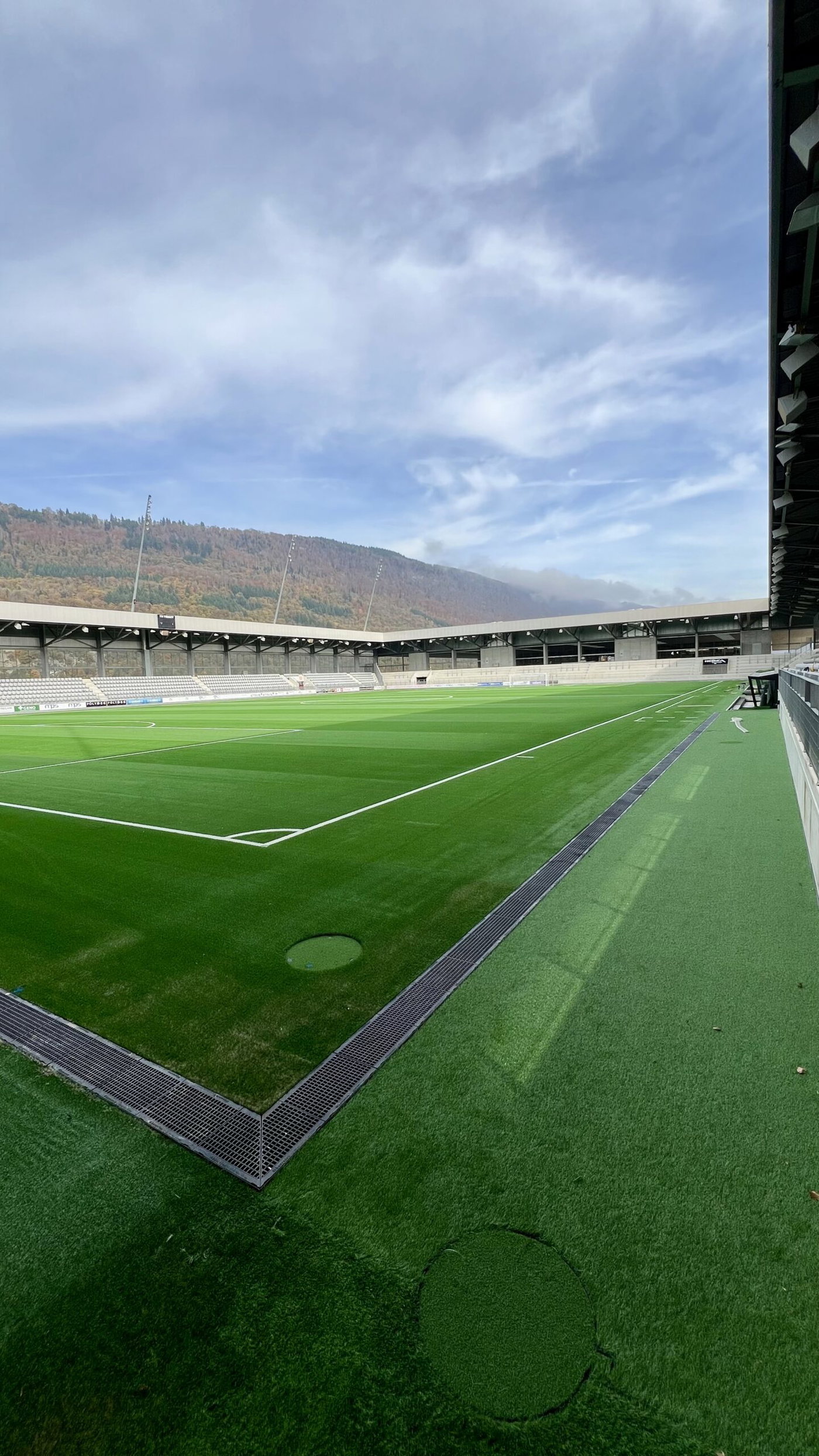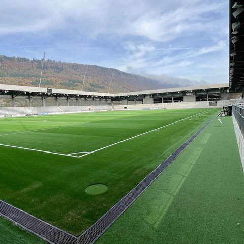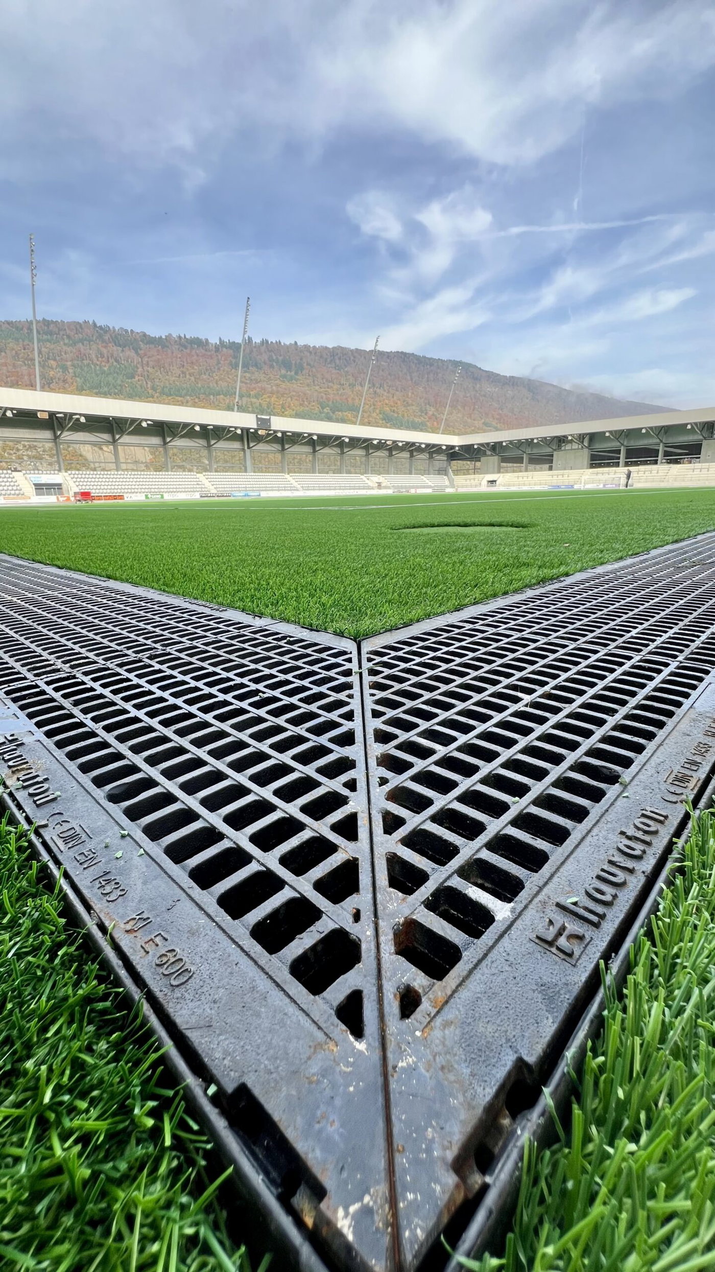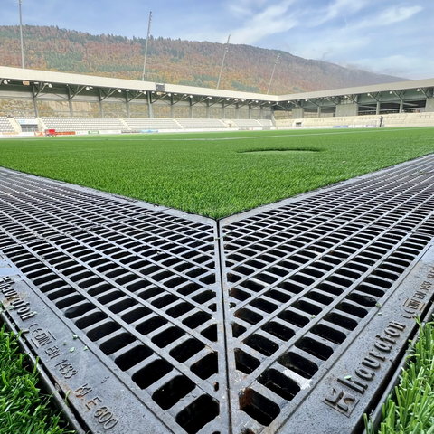 La Tissot Arena à Bienne est un exemple parfait d’infrastructure moderne de stade et de gestion réfléchie des eaux pluviales. Un total de 380 mètres de caniveaux FASERFIX KS 300 et 760 grilles GUGI de classe de charge E600 ont été installés : une combinaison qui garantit capacité portante maximale, précision et durabilité.