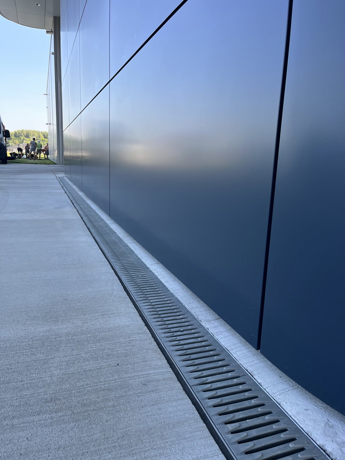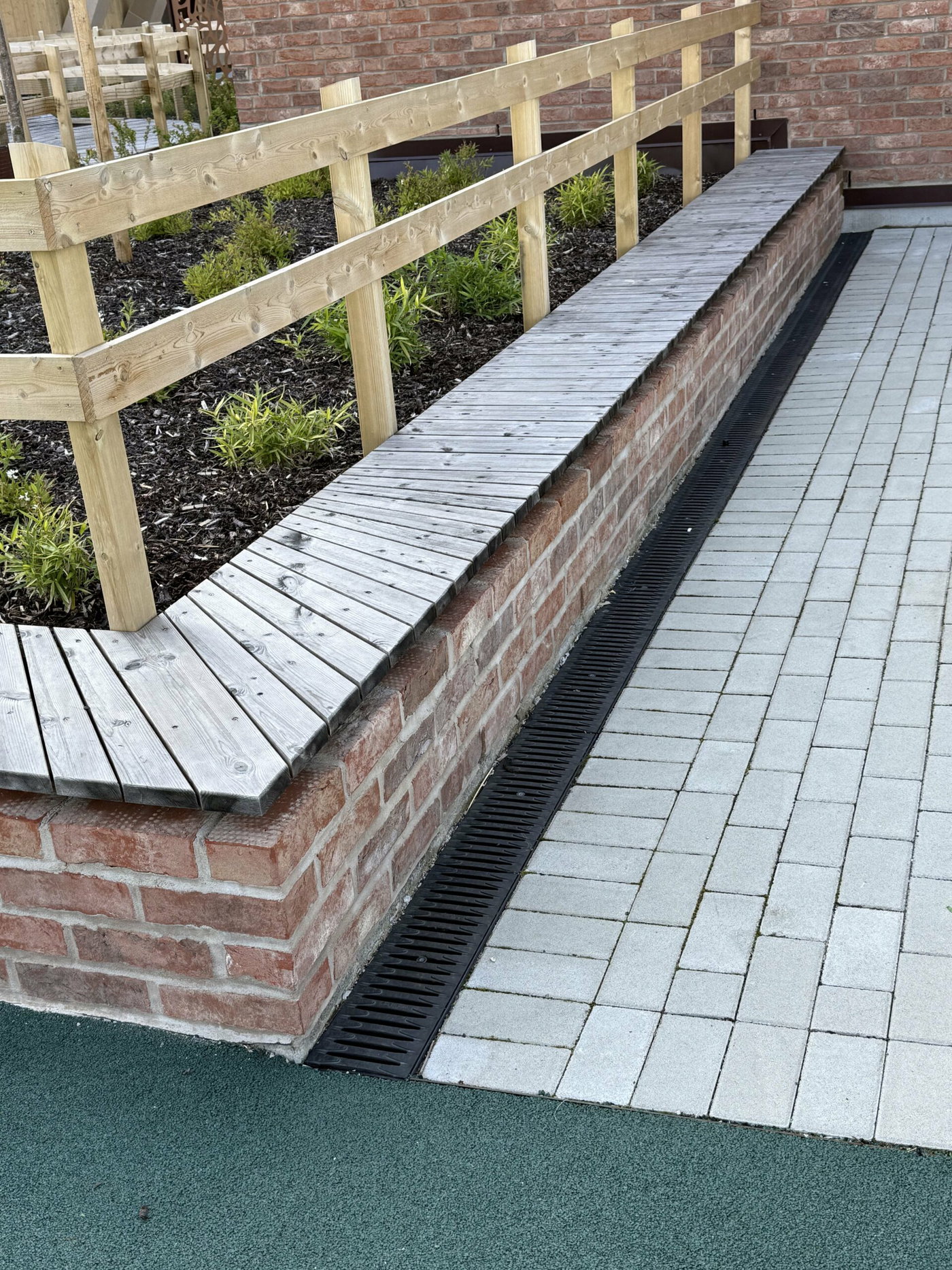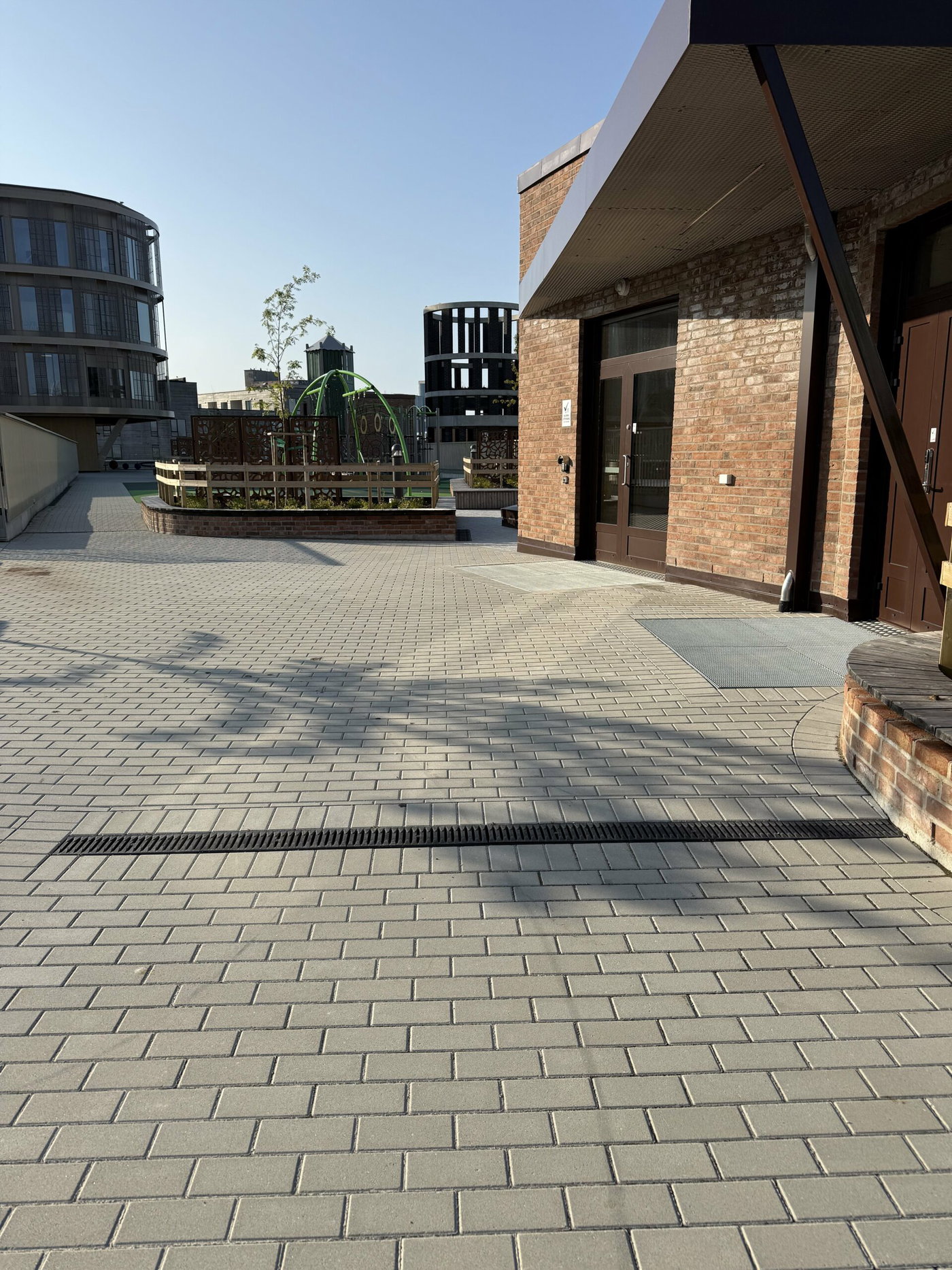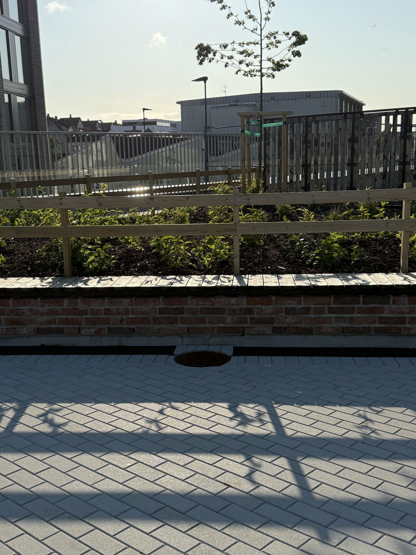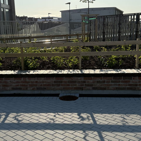 Ce projet illustre de manière exemplaire la polyvalence des produits HAURATON et leur intégration dans des concepts de design durable. Un point particulièrement remarquable est l’adaptation technique sur mesure : une paroi interne de 5 à 7 cm de hauteur a été ajoutée à l’intérieur des caniveaux avant les sorties, permettant à la totalité du caniveau de fonctionner comme piège à sable. Ce détail a été spécifiquement demandé par l’architecte.