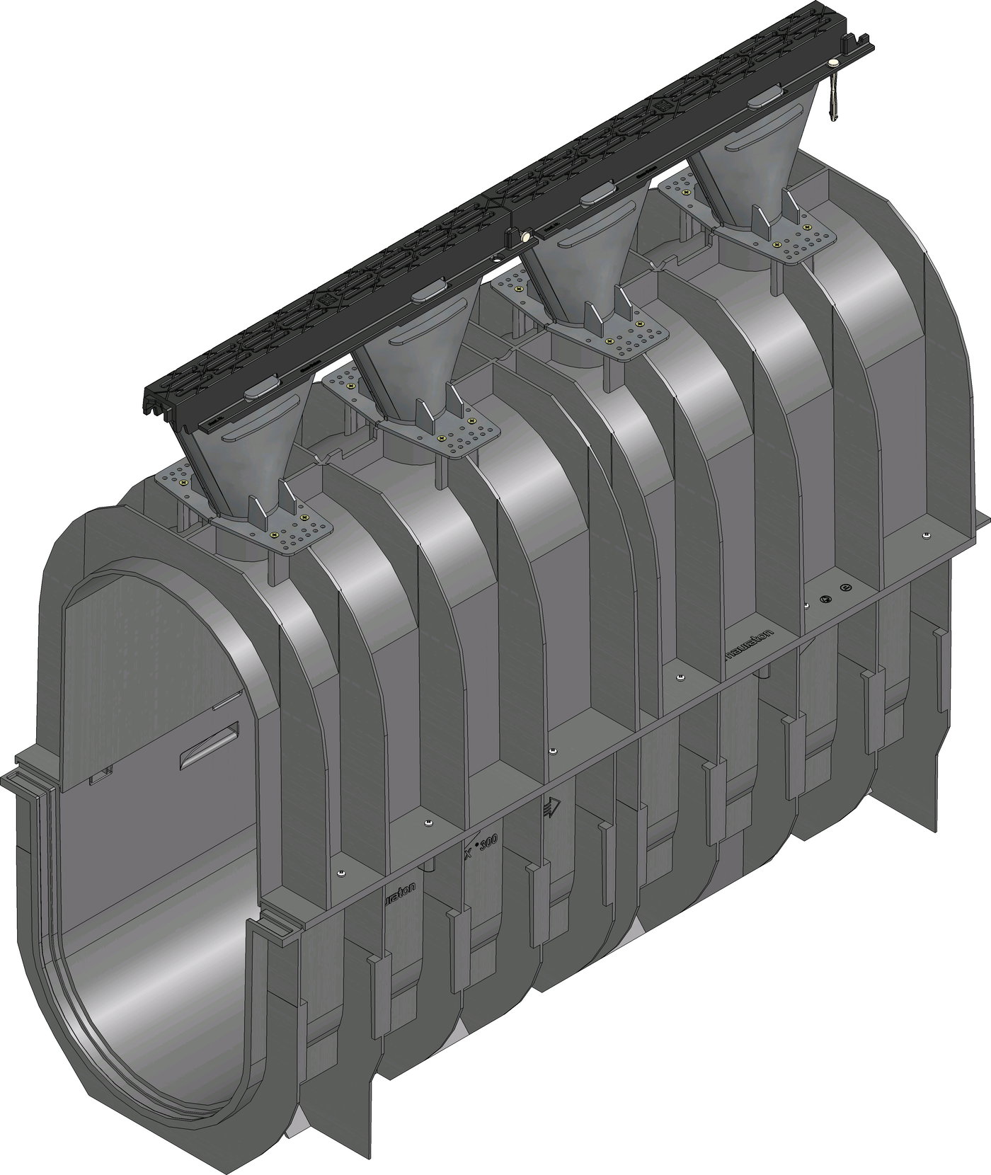 RECYFIX HICAP F 8200 - Caniveau et canalisation combinée. Système monobloc en PP. Avec cadre à fentes, en fonte EN-GJS, fentes 6 mm, relié au caniveau par 4 collecteurs en PA de 200mm de hauteur. Emboitements mâle femelle. Classe de charge jusqu'à D400, selon norme EN 1433, conformité CE. L/l/h 1000x432x950mm, Art n°13610