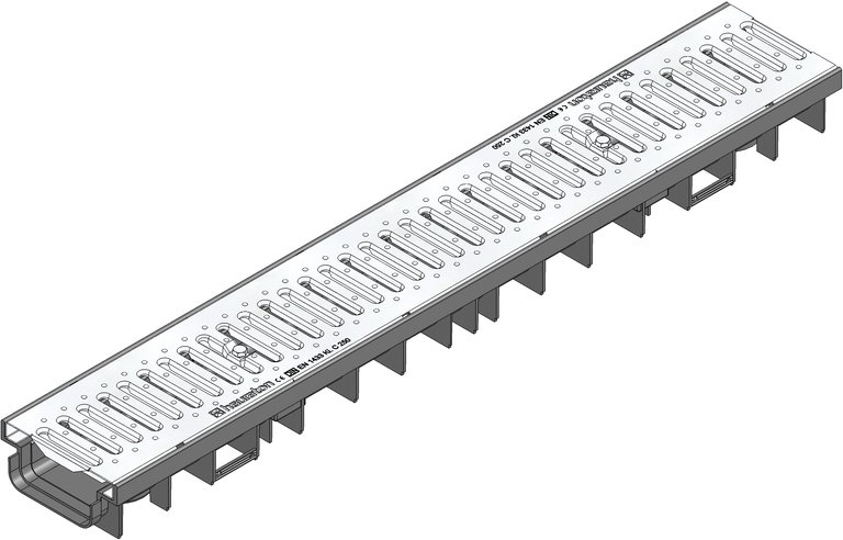 Caniveau RECYFIX PRO 100 type 75, en PP, structure à nervures renforcées, de type M. Cornières renforcées de 20 mm de hauteur, intégrées au caniveau. Emboitements mâle femelle. Possibilité de raccordement vertical DN 75. Avec grille passerelle double âme en acier inoxydable CNS 1.4301, fentes 80x10, montée et clavetée. Classe de charge C250, selon norme EN 1433, conformité CE. L/l/h 1000x160x75mm, Art n°47016