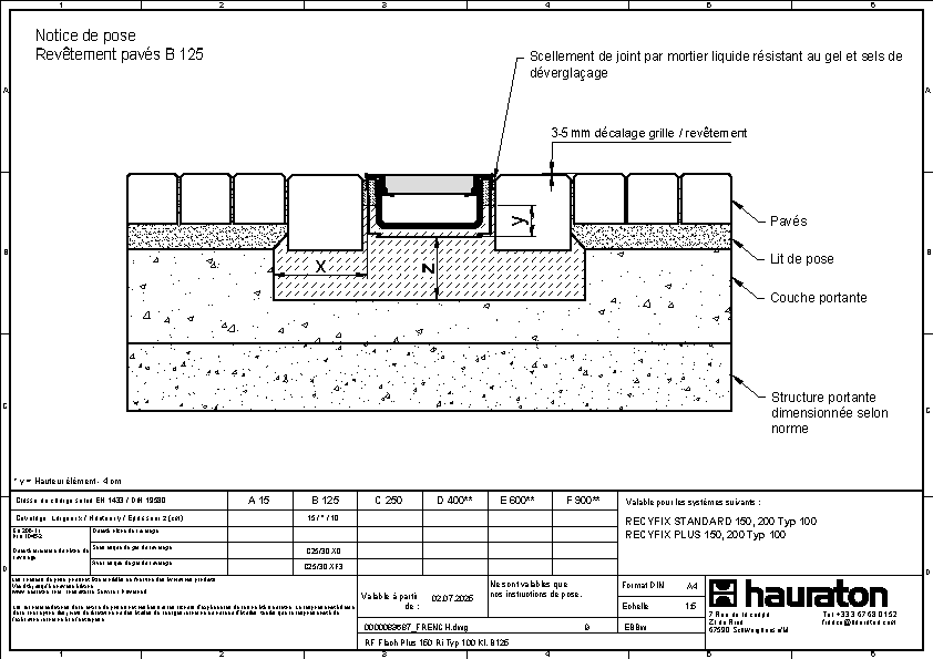 Caniveau RECYFIX STANDARD 150 type 01, avec GUGI caillebotis fonte, noires, mailles 16x24, classe C250, montées et clavetées