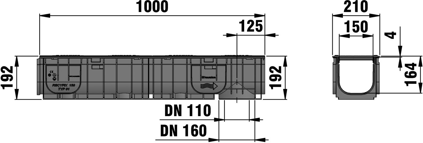 RECYFIX STANDARD 150, típus: 01 - PE-PP visszaforgatható műanyagból készült folyóka, DIN V 19580/EN 1433 szerint, GUGI-öntöttvas négyzetráccsal, rácskiosztás: 20/30, fekete, terhelési osztály: A 15 - C 250, H/SZ/M 1000x210x192 mm, cikkszám: 40175