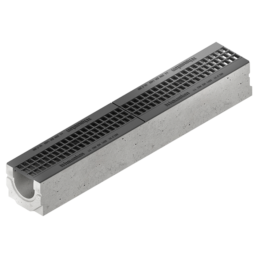 Folyókák szálerősítéses betonból, DIN V 19580 / EN 1433 szerint, CE-konform, biztonsági fugával, acélperemmel és SIDE-LOCK csavarmentes rögzítő rendszerrel, féde-nút csatlakozással a pontos beépítésért