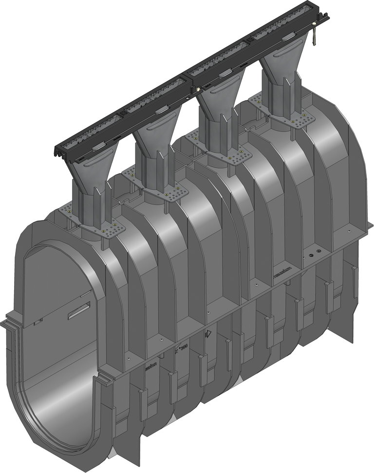RECYFIX HICAP F 8300 Canaletta monoblocco prefabbricata ad elevata capacità di accumulo, formata da un corpo canale in polipropilene ad elevate prestazioni, con coni di ingresso acqua in poliammide (PA), fissati al corpo del canale tramite viti di fissaggio, con griglia a fessura 28 mm in ghisa sferoidale GJS 500-7,con rivestimento anticorrosivo in KTL, classe di carico fino alla F 900 secondo la normativa DIN V19580/EN1433 ,1000 mm, art 13680