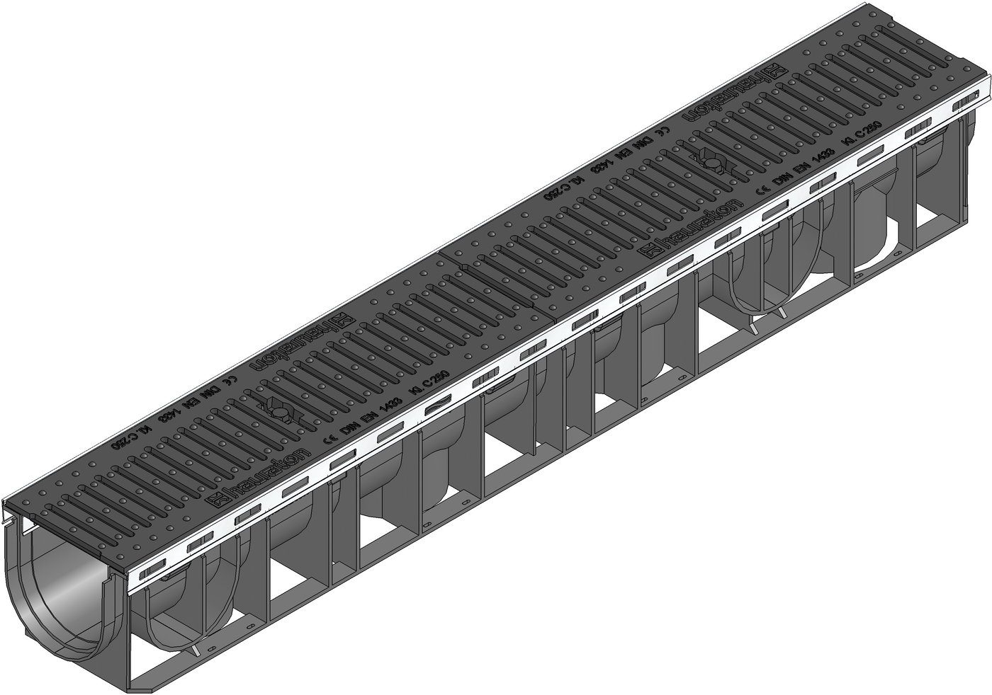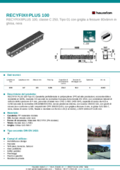RECYFIX PLUS 100 Tipo 01 Canaletta prefabbricata in polipropilene (PP) ad alte prestazioni, ecosostenibile e riciclabile al 100%, marcata CE secondo la normativa Europea Armonizzata EN 1433, con costolature laterali di rinforzo dello spessore di 4 mm, provvisto di telaio inox CNS 1.4301 (AISI 304), capacità di carico da A15 a C250 secondo la normativa DIN19580/EN1433, senza pendenza interna, con scarico DN/OD 110, con giunti di sicurezza e conforme a tutti i requisiti del CPR 305/2011/EU, con griglia a fessure 6 mm, in ghisa GJS 500-7, nera, classe di carico C250, fissate e montate con fermi e viti (2 al metro), L/W/H 1000x147x135 mm