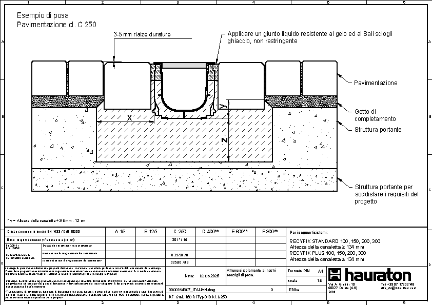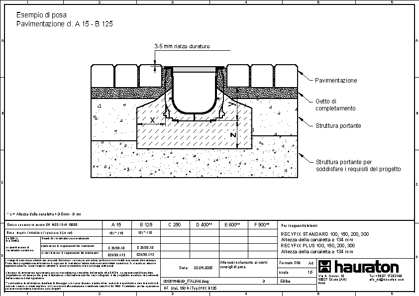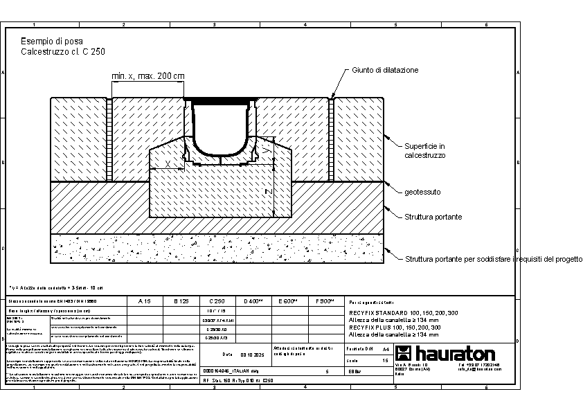 RECYFIX PLUS 150 Tipo 01 Canaletta prefabbricata in polipropilene (PP) ad alte prestazioni, ecosostenibile e riciclabile al 100%, marcata CE secondo la normativa Europea Armonizzata EN 1433, con costolature laterali di rinforzo dello spessore di 4 mm, provvisto di telaio in acciaio zincato, capacità di carico da A15 a C250 secondo la normativa DIN19580/EN1433, senza pendenza interna, con scarico DN/OD 110/160, con giunti di sicurezza e conforme a tutti i requisiti del CPR 305/2011/EU, con griglia a maglia 30x10 mm, in acciaio zincato, classe di carico B125, fissate e montate con fermi e viti (2 al metro), L/W/H 1000x202x193 mm