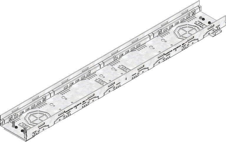 DACHFIX STEEL 135 type 45 - Lijngootelement met verstelsets voor hoogteaanpassing, van corrosiebeschermd verzinkt staal, beloopbaar en rolstoeltoegankelijk, rooster naar binnen gekanteld, met perforatie in de zijkant en het bodemgebied voor aansluiting DN/OD 75 of DN/OD 110 en 8-voudige aansluitmogelijkheid in de zijkant voor aftakkanaal, incl. 4-voudige muurankerfunctie, incl. 2 verstelsets/1 m stuk, hoogteverstelbaarheid 59-74 mm, LxBxH 1000x135x59-74 mm, art.nr. 65103