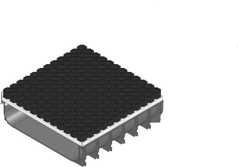 SPORTFIX zandvang, onderdeel van gemodificeerd Polypropyleen, zwart, voorgevormde aansluitmogelijkheid DN/OD 110, met enkelzijdig metalen profiel t.b.v. baanaansluiting, met mazenrooster, maaswijdte 30/30, verzinkt staal en stevig bevestigde rubberen mat, beloopbaar, LXBXH 500x500x163 mm, art.nr. 7745