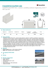 FASERFIX SUPER 400 typ 01H - Korpus koryta wykonany z betonu kl. C35/45 ze zbrojeniem rozproszonym (mieszanka cementu, kwarcu i włókna). Krawędzie koryt wykonane ze stali z powłoką cynkowo-magnezową o wysokości 40 mm i szerokości 45 mm w najszerszym miejscu, zakotwione w bocznych ścianach za pomocą 4 zabezpieczonych antykorozyjnie kotew na każdą stronę koryta. Krawędzie koryt wyposażone w 8 specjalnych poziomych zamków pod ruszt, w system zatrzaskowy SIDE LOCK, w owalne otwory pod trzpienie z rusztów w ilości 8 szt., a także w 8 gwintowanych otworów pod śruby mocujące ruszt na każdy metr odwodnienia. Boczne ścianki koryta gładkie, bez wcięć i wyżłobień, dno koryta chropowate zapewniające dobrą przyczepność z podbudową betonową. Koryta łączone systemem pióro-wpust. Klasa wytrzymałości korpusu koryta bez rusztów = F 900. Ognioodporność: klasa A1 (koryto niepalne). Znakowanie na ramie zgodnie z PN-EN 1433, posiadające dopuszczenia DWU.