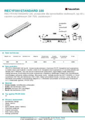 RECYFIX STANDARD 100 typ 60 - Korpus koryta wykonany z tworzywa PE-PP. Krawędzie koryt wyposażone w owalne otwory pod trzpienie z rusztów w ilości 8 szt. Krawędzie koryt wyposażone w 4 poziome gniazda pod blokady ANTY WANDAL. Dno oraz boczne ścianki koryta użebrowane, zapewniające trwałe połączenie z opaską betonową. Konstrukcja dna koryta wyposażona w dodatkowy stabilizujący szkielet oraz wyprofilowanie umożliwiające wykonanie odpływu dolnego. Mocowanie rusztu - blokada poprzeczna ANTY WANDAL x2. Ruszt szczelinowy SW 75/9, stal nierdzewna CNS 1.4301. Klasa wytrzymałości koryta z rusztem = przej. dla sam. os. Minimalna wytrzymałość na temperaturę stałą 80 st. C. Minimalna wytrzymałość na temperaturę chwilową 95 st. C. Znakowanie zgodnie z PN-EN 1433.