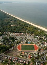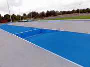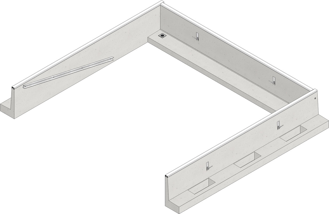 SPORTFIX, zestaw do zabudowy rowu z wodą wykonany z betonu kl. C50/60 zbrojonego stalą, górna powierzchnia ścian bocznych i ściany tylnej wyposażona w białą nakładkę zabezpieczającą z EPDM, boczne ściany wyposażone w perforowane, regulowane kątowniki umożliwiające wykonanie nawierzchni wewnątrz rowu z wodą, tylna ściana z odpływem DN75 mm, produkt spełnia wymogi World Athletics i PZLA.