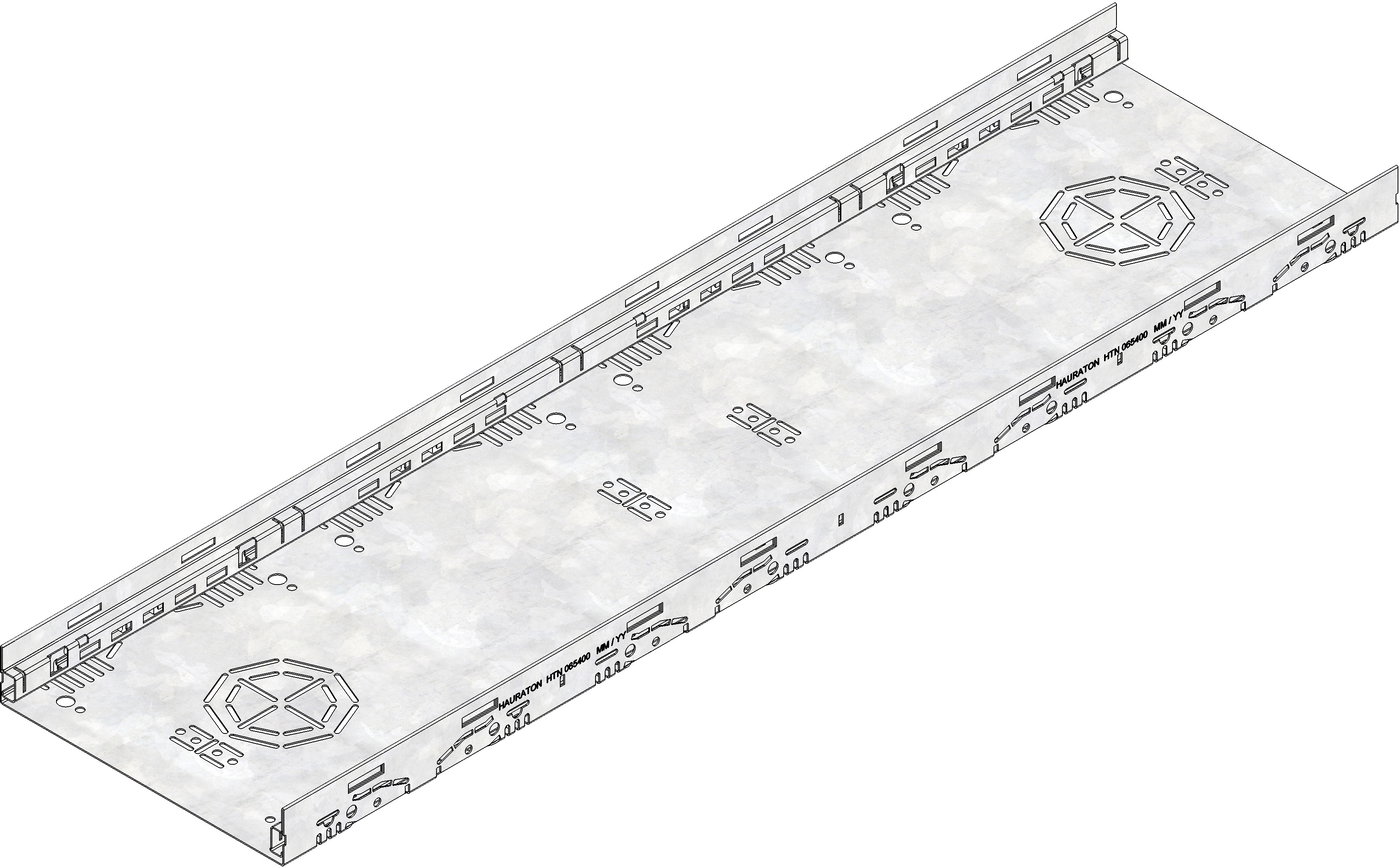 DACHFIX STEEL 255 tip 45 - Telo kanala, napravljena od pocinkovanog čelika zaštićenog od korozije, pristupačno za pešake i invalidska kolica, nosač rešetke nagnut prema unutra, s perforacijom sa strane i u dnu kanala, sa mogućnošću spajanja u dnu kanala za cevni spoj DN/OD 75 ili DN/OD 100, kao i bočnom 8-strukom mogućnošću spajanja za krstasti kanal, sa integrisanim, opcionalnim 4-strukim sidrenjem za zid, DxŠxV 1000x255x45 mm, artikl br. 65400