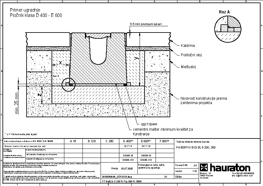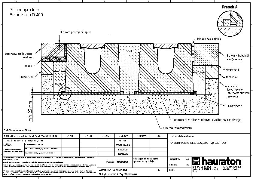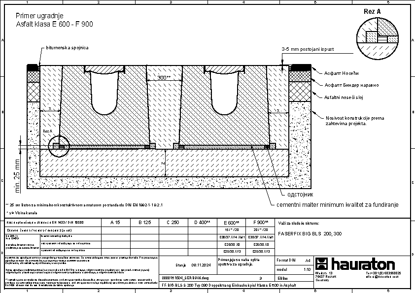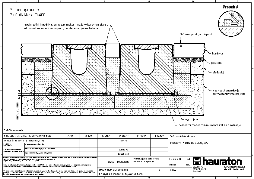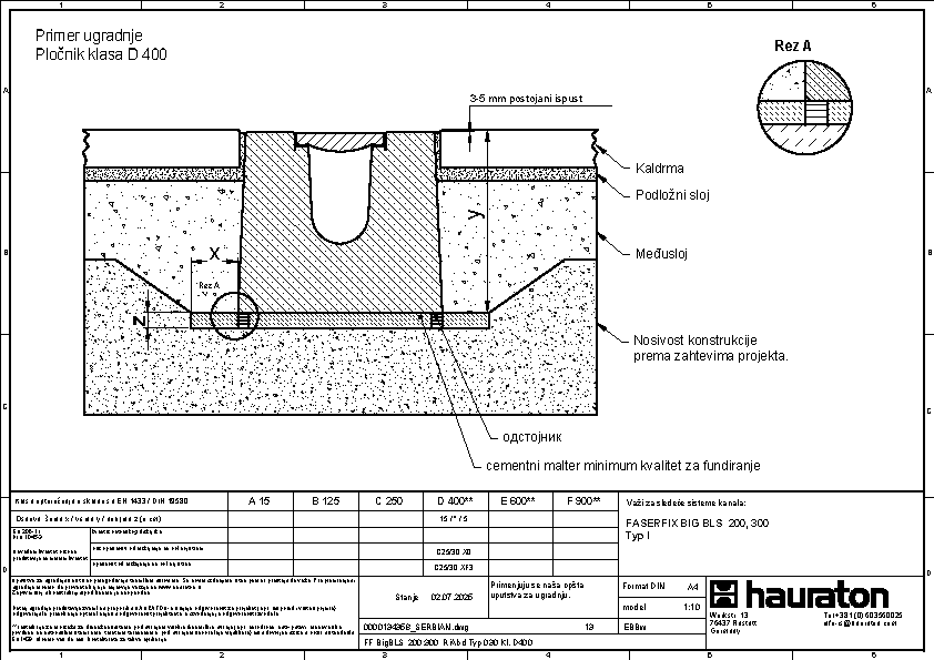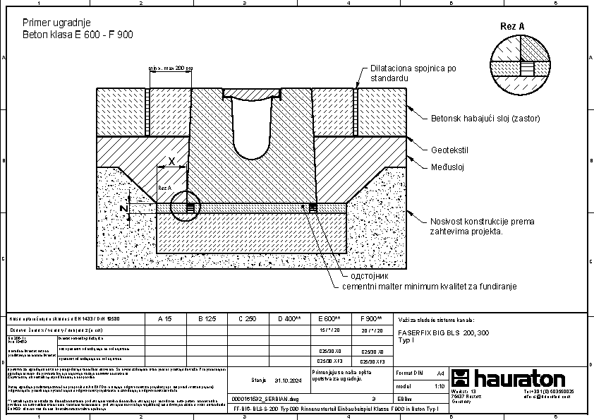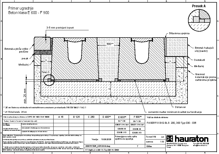 FASERFIX BIG BLS 200 tip 035 - Telo kanala napravljena od prefabrikovanog FDE betona armiranog čelikom (nepropusno za tečnosti nakon ispitivanja penetrantima) C60/75, klasa reakcije na vatru A1 prema EN 13501-1, klasa opterećenja A 15 – F 900 prema EN 1433, s ispitanim statičkim proračunom i dimenzioniranjem za LCN 20 prema ICAO-u. Prema Nemačkom udruženju zračnih luka (ADV) za BFZ ( referentni avion) 90, model opterećenja 1 - FS2 prema DIN EN 1991-2, s odlučujućim osovinskim opterećenjem od Qa = 20, s proverom otpornosti na umor na temelju reprezentativnog broja superponiranih ciklusa opterećenja, presek odvodnje od 552 cm², sa rubom od nerđajućeg čelika CNS 1.4301, 16-struka mogućnost zaključavanja po metru, sa sistemom zaključavanja bez vijaka SIDE-LOCK, dodatno moguće 8-struko vijčano spajanje, s Fabrički montiranim PE umetkom za dilataciju th = 10 mm na jednoj prednjoj strani, s nacionalnim tehničkim odobrenjem za LAU postrojenja i AKR ispitivanjem performansi, dubina umetanja rešetke 40 mm, DxŠxV 5000x600x575 mm, artikl br. 3726