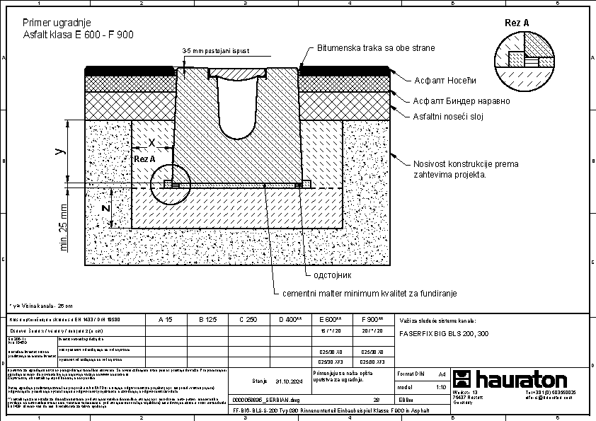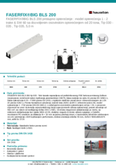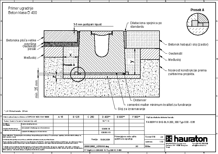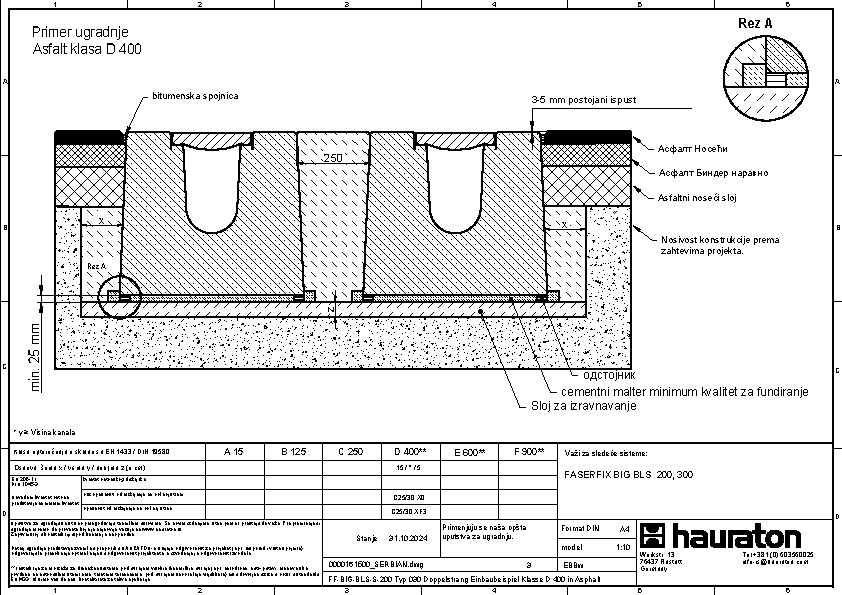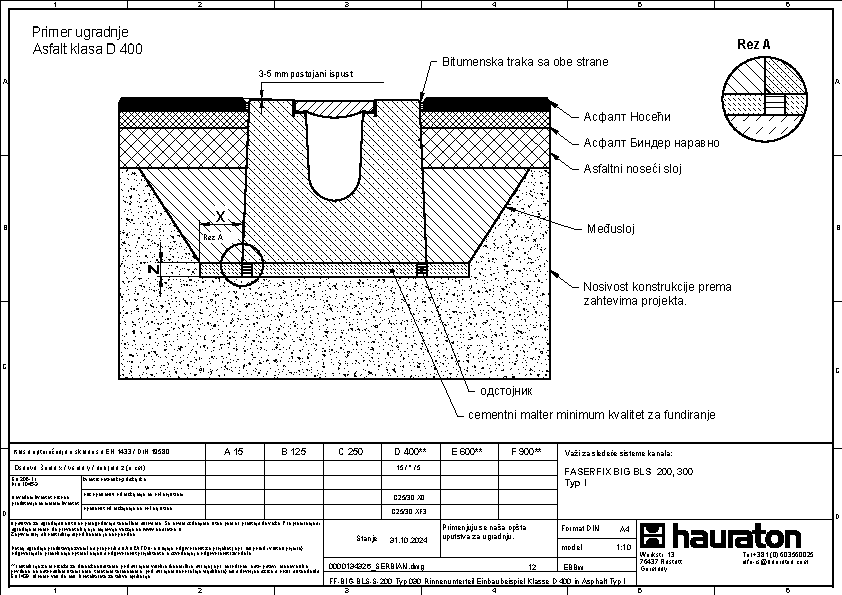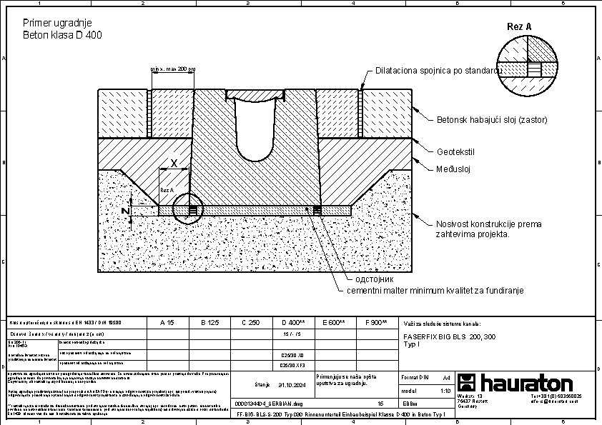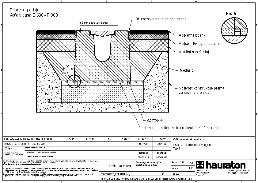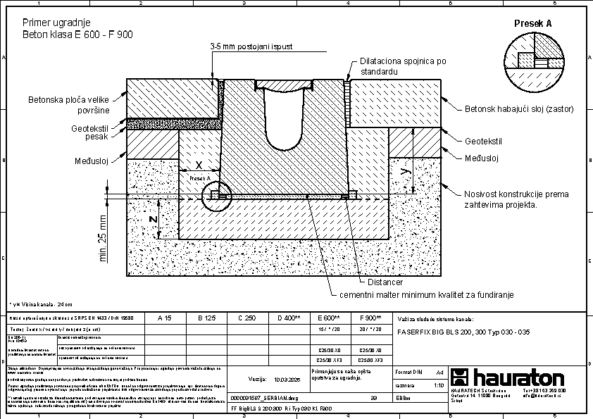 FASERFIX BIG BLS 200 tip 035 - Telo kanala napravljena od prefabrikovanog FDE betona armiranog čelikom (nepropusno za tečnosti nakon ispitivanja penetrantima) C60/75, klasa reakcije na vatru A1 prema EN 13501-1, klasa opterećenja A 15 – F 900 prema EN 1433, s ispitanim statičkim proračunom i dimenzioniranjem za LCN 20 prema ICAO-u. Prema Nemačkom udruženju zračnih luka (ADV) za BFZ ( referentni avion) 90, model opterećenja 1 - FS2 prema DIN EN 1991-2, s odlučujućim osovinskim opterećenjem od Qa = 20, s proverom otpornosti na umor na temelju reprezentativnog broja superponiranih ciklusa opterećenja, presek odvodnje od 552 cm², sa rubom od nerđajućeg čelika CNS 1.4301, 16-struka mogućnost zaključavanja po metru, sa sistemom zaključavanja bez vijaka SIDE-LOCK, dodatno moguće 8-struko vijčano spajanje, s Fabrički montiranim PE umetkom za dilataciju th = 10 mm na jednoj prednjoj strani, s nacionalnim tehničkim odobrenjem za LAU postrojenja i AKR ispitivanjem performansi, dubina umetanja rešetke 40 mm, DxŠxV 5000x600x575 mm, artikl br. 3726