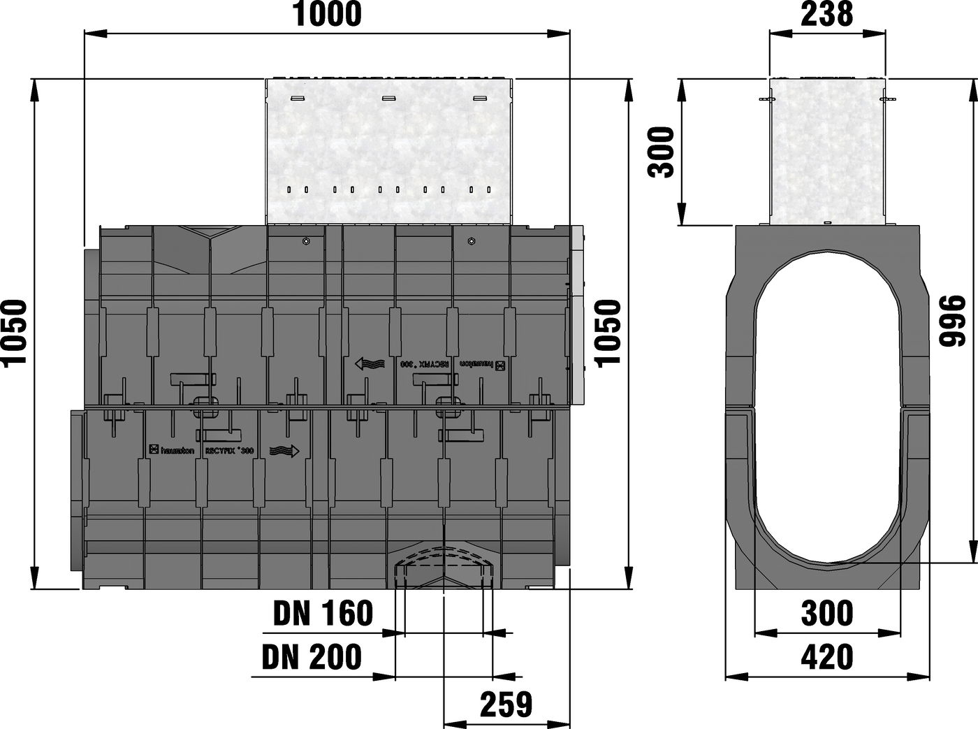 RECYFIX HICAP 8300 Reviziona jedinica, prema EN 1433, CE usaglašeno, sastoji se od tela kanala napravljenog od recikliranog polipropilena i gornjeg elementa, visine 300 mm, napravljenog od pocinkovanog čelika, sa rešetkom od nodularnog liva zatvorenom od