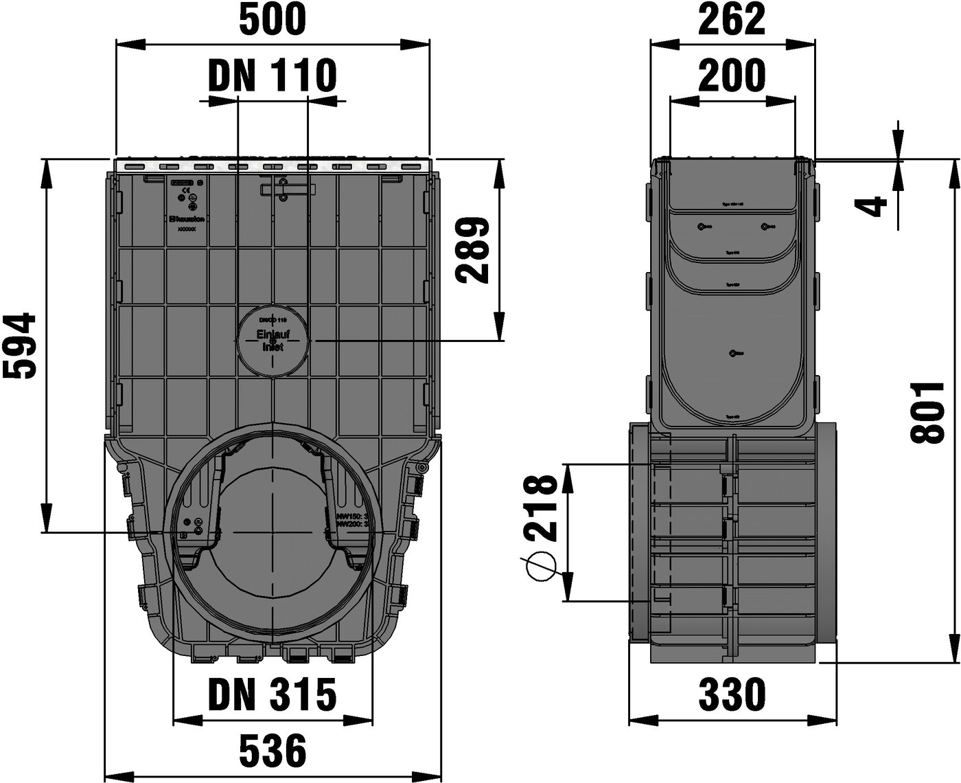 RECYFIX PLUS 200 - Sabirno okno napravljeno od recikliranog polipropilena, sa rubom od pocinkovanog čelika, sa obe strane prethodno oblikovanim spojnim elementom za cevi DN/OD 315,sa kantom za mulj napravljenom od recikliranog polipropilena, s 2 završna poklopca napravljena od recikliranog polipropilena, odgovarajuće za obostrano spajanje kanala tipova RECYFIX PLUS 200, sa rešetkom od livenog gvožđa 2x SW 85/20 mm, napravljena od livenog gvožđa EN-GJS-500-7, crne boje, sa uzdužnom zaštitom od klizanja i zaključavanjem, klasa opterećenja A 15 - C250 prema EN 1433, DxŠxV 500x262x801 mm, broj artikla 40052