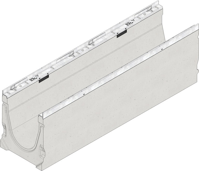 FASERFIX KS 200 tip 1-9 - kanaleta iz betona armiranega z vlakni, rešetke obremenitveni razred A 15 - F 900 po DIN V 19580/EN 1433, v skladu s CE, z vgrajenim padcem 0,5%, s pocinkanim okvirjem in brezvijačnim sistemom pritrjevanja rešetk SIDE-LOCK, 8 točkovna pritrditev, D/Š/V 1000x260x275-320 mm, št. art. 12001-12009